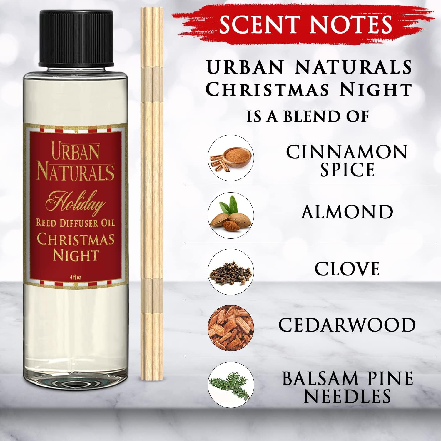 Urban Naturals Reed Diffuser Oil Refill Christmas Night, Cinnamon, Pine, Sweet Berries, Cozy Holiday Fragrance, 4 oz + Free Reed Sticks, Made in The USA