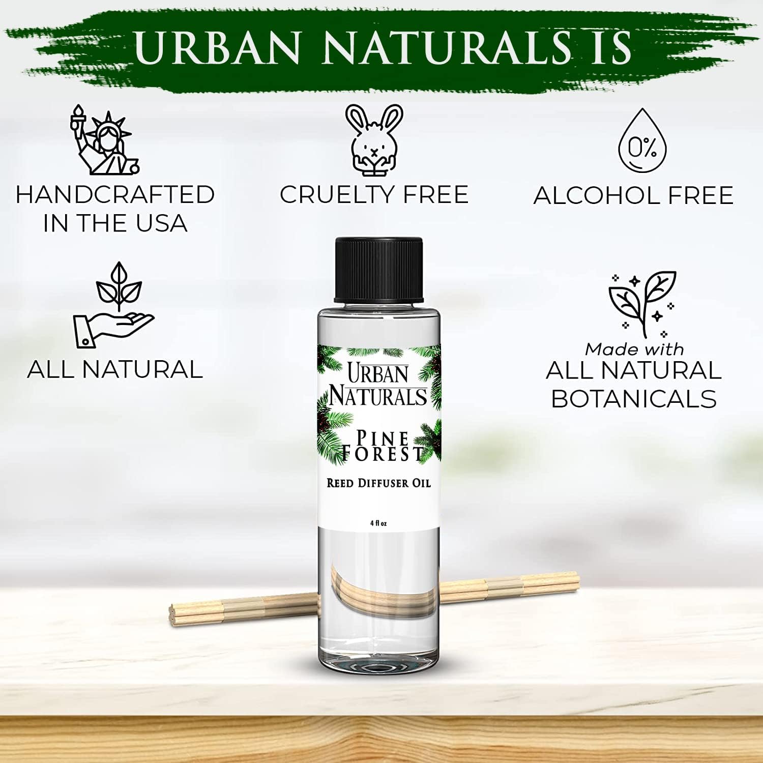 Urban Naturals Reed Diffuser Oil Refill Pine Forest, Fir Needles, Fresh Pine, Holiday Tree Aroma, 4 oz + Free Reed Sticks, Made in The USA