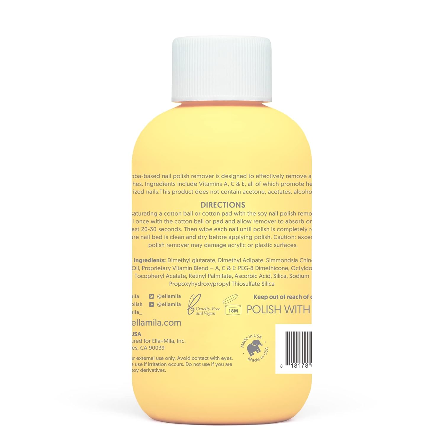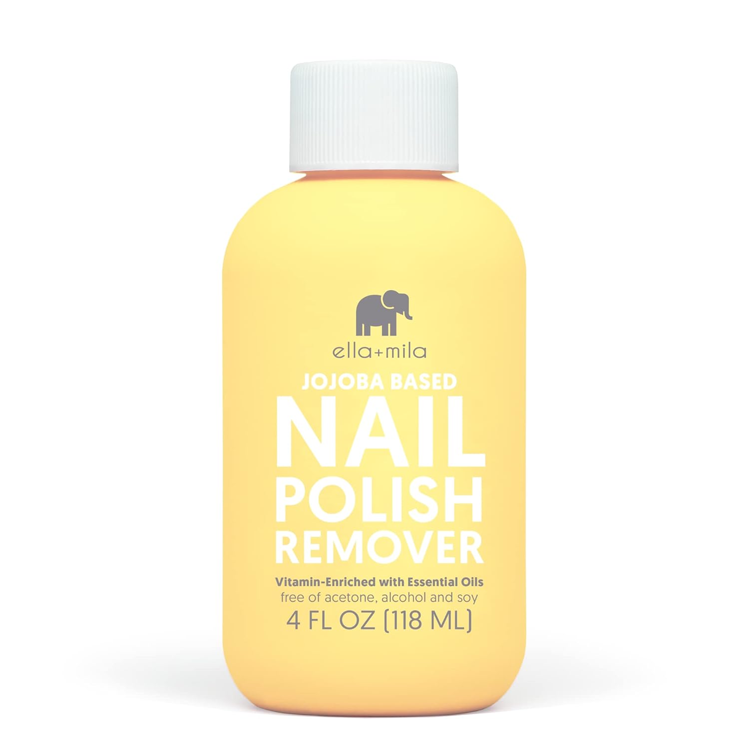 - Jojoba Polish Remover by ella+mila: non-toxic nail polish remover made without acetone & alcohol; Formulated to effectively remove natural nail polishes; With jojoba oil and enriched with vitamins A, C & E to promote healthy & moisturized nails