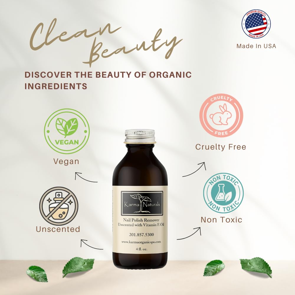 - NATURAL INGREDIENTS: Every beauty-conscious person wants natural products. Karma Organic ensures pure & and natural ingredients that work on various nail polishes; glitter, and matte. Our acetone-free nail polish remover contains Soybean oil. With no toxic ingredients, our formula is simply gentle, nourishing, and effective!