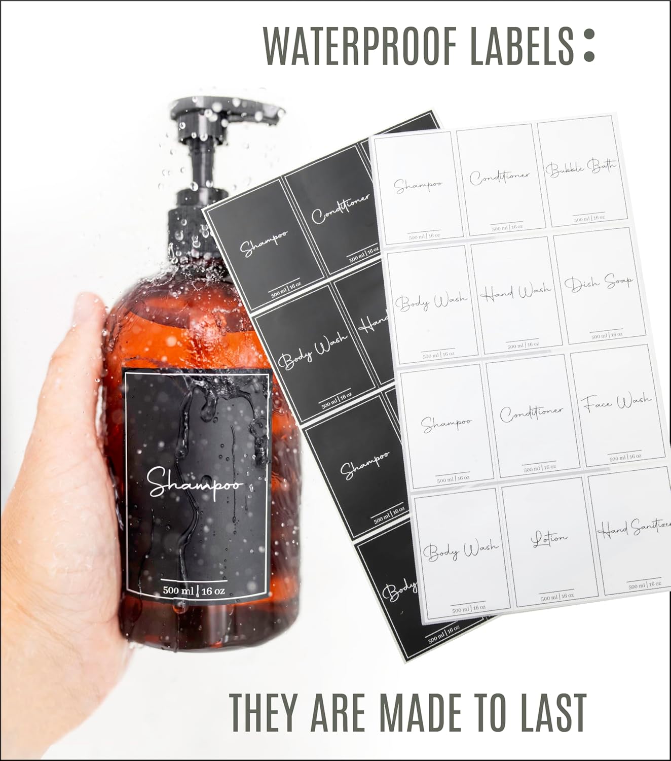 - PACK OF FIVE - Our pack includes five 16oz apothecary bottles to store your cleaning liquids, including shampoo, handwash, sanitizer, massage oils, and more. We also include 24 waterproof labels (12 black & 12 white) measuring 2.36in (6cm) by 2.76in (7cm) for easy labeling and customization.