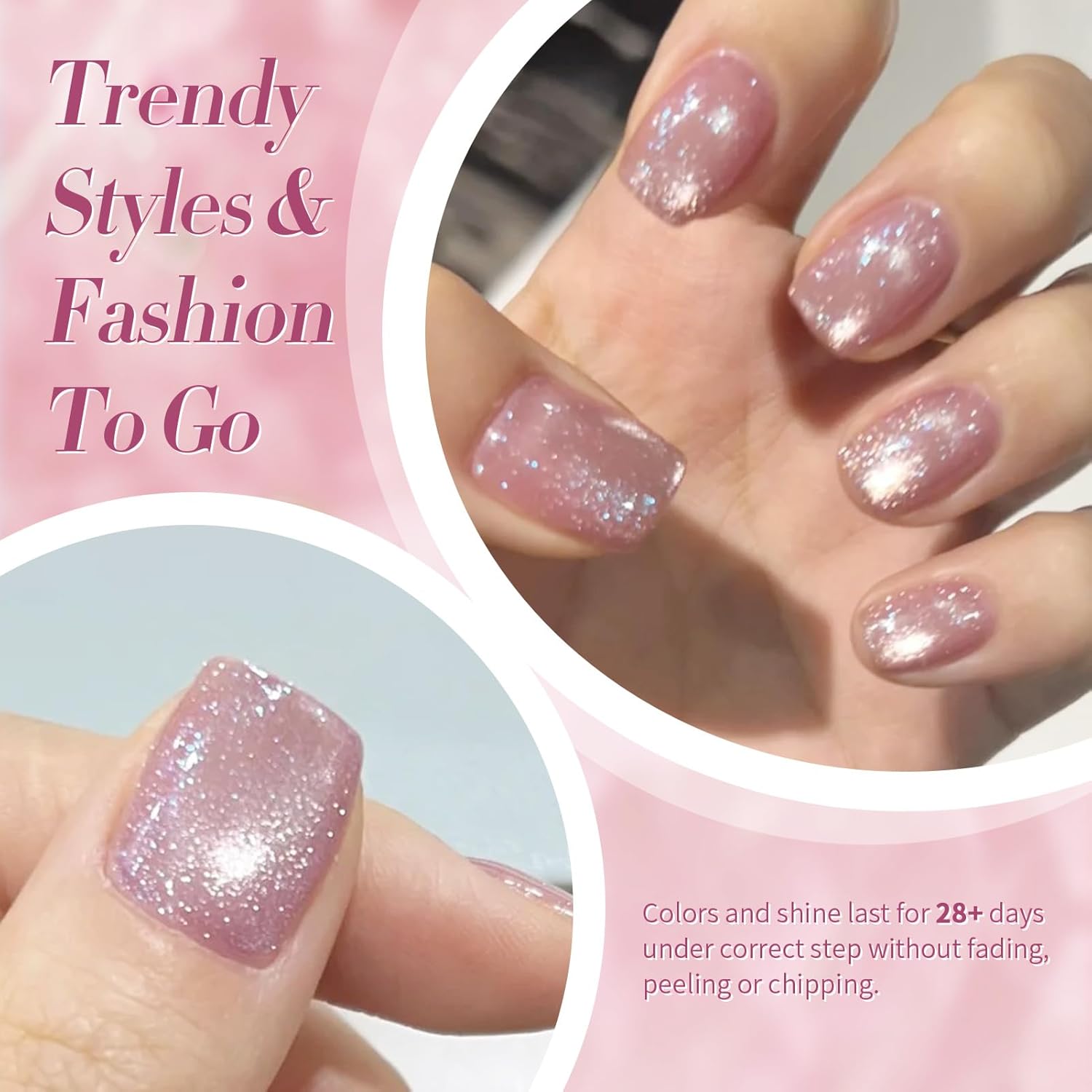 - EASY APPLICATION AND GOOD TENACITY: The series of nude pink magnetic gel nail polish set is long lasting for 21+ days with perfect shine under proper application - With base gel top coat under the full application process.High durability and intense pigmentation makes it stay last longer and brings you brilliant shine finish.