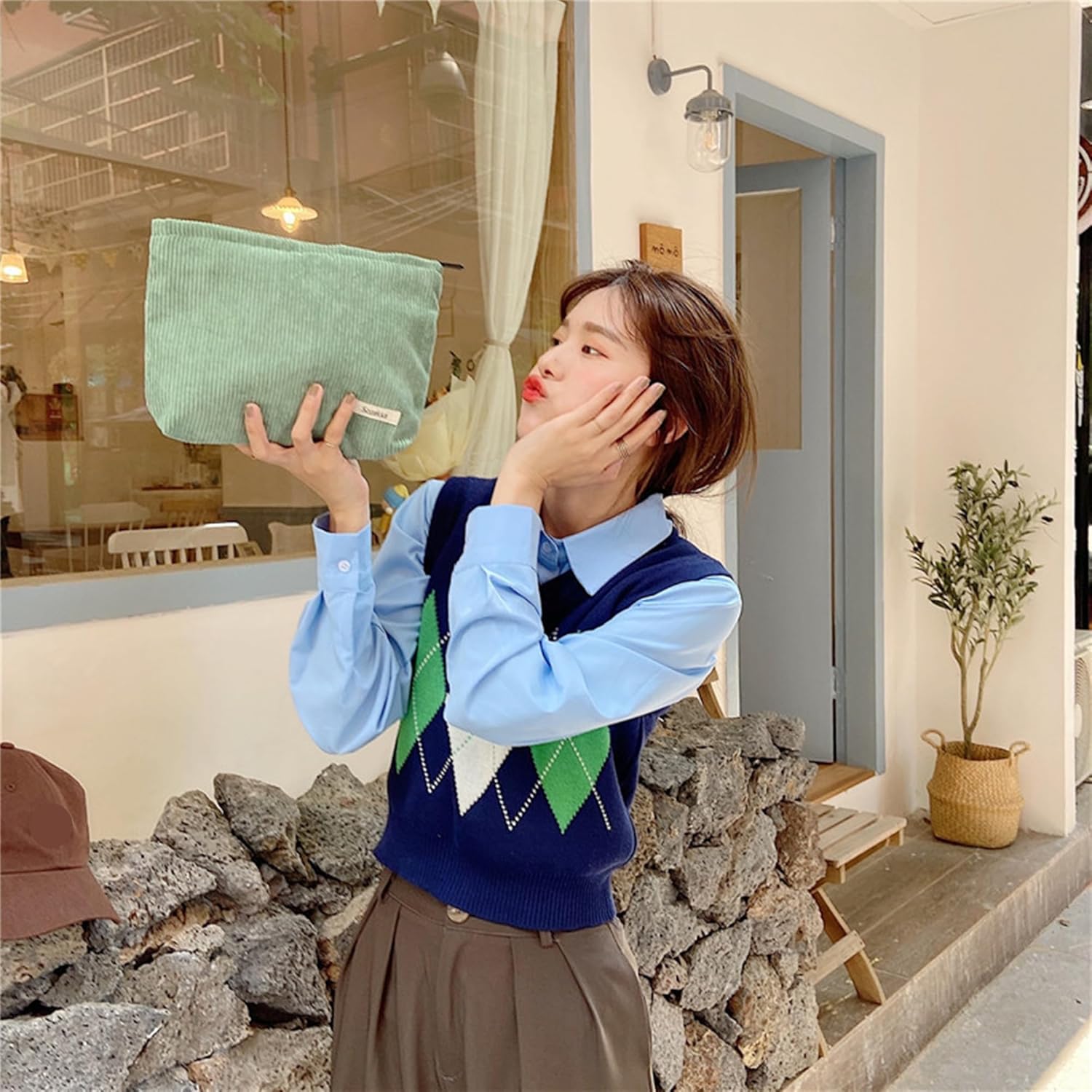 Cosmetic Bags for Women - Corduroy Cosmetic Bag Aesthetic Women Handbags Purses Smile Dots Makeup Organizer Storage Makeup Bag Girls Case Bags (Pure Green)