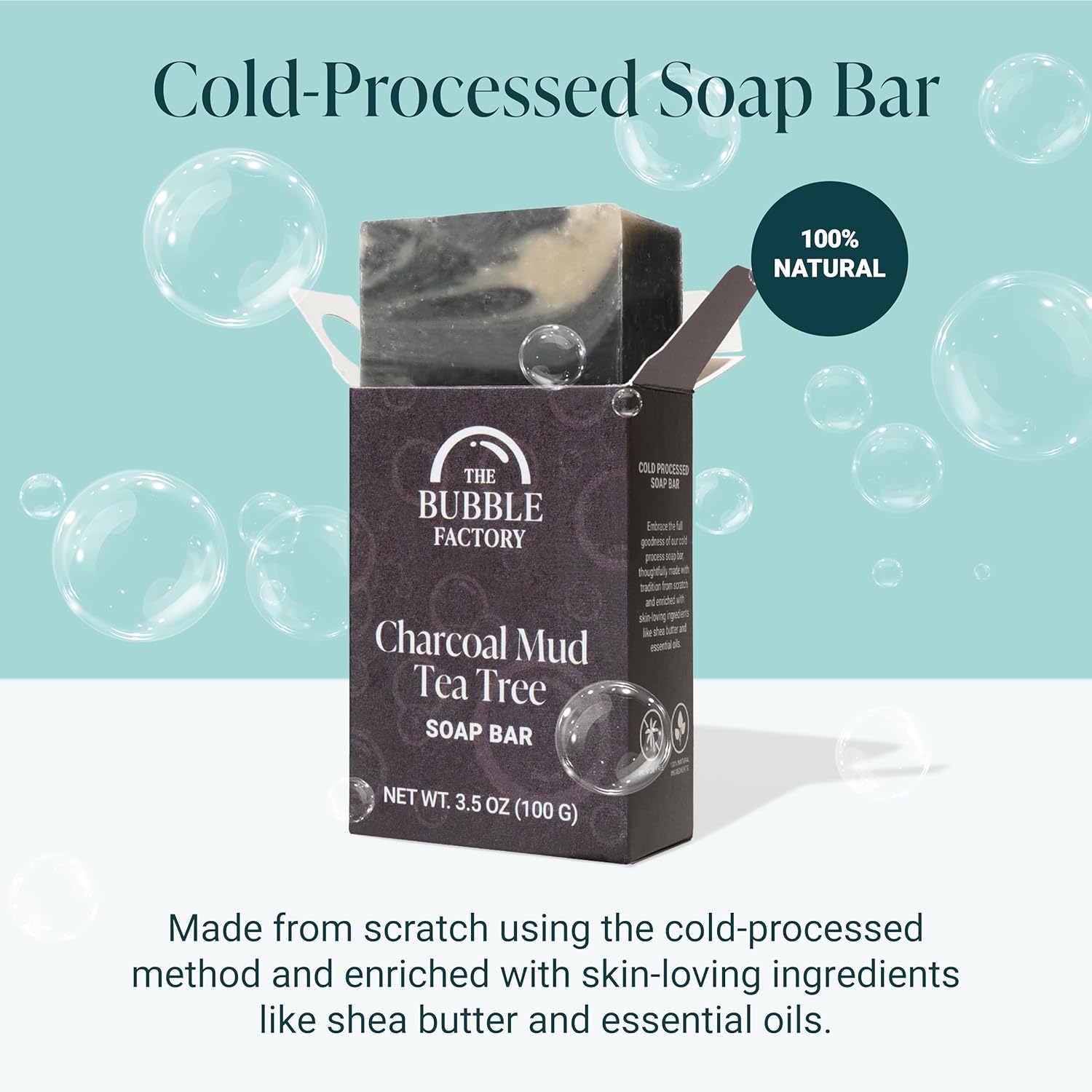 - CHARCOAL MUD TEA TREE SCENTED SOAP BAR: Embrace the purifying power of our Charcoal Mud Tea Tree soap bars. Features a clean, camphorous scent with the herbal goodness of Tea Tree essential oil. Infused with magnesium-rich Dead Sea mineral mud, this soap bar ensures a deep, refreshing foaming cleanse, leaving your skin feeling soft yet energized