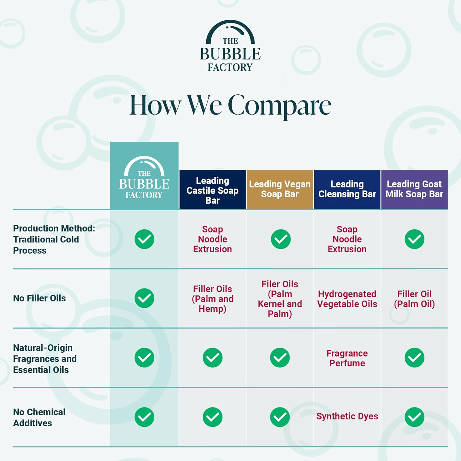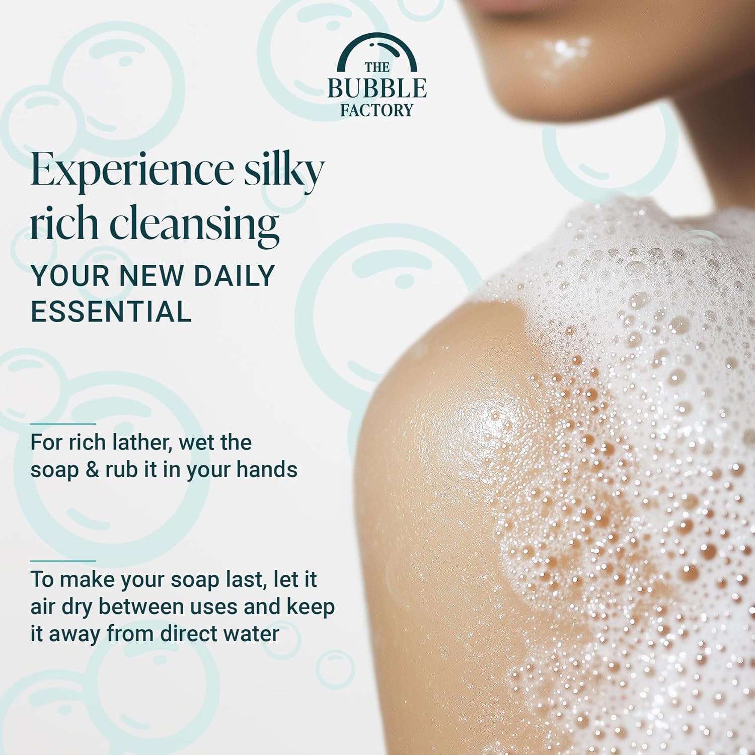 - PALM OIL FREE: The Bubble Factory bar soap is crafted in a Cosmetic GMP Certified facility with natural ingredients. Free from harsh chemicals like SLS, phthalates, and parabens. Palm oil free, vegan, cruelty-free, detergent free, non-toxic, and gluten-free soap that is 97% naturally derived (even for the most sensitive of skin). Each bar can last up to 4 weeks with proper drying care and moderate consistent daily use