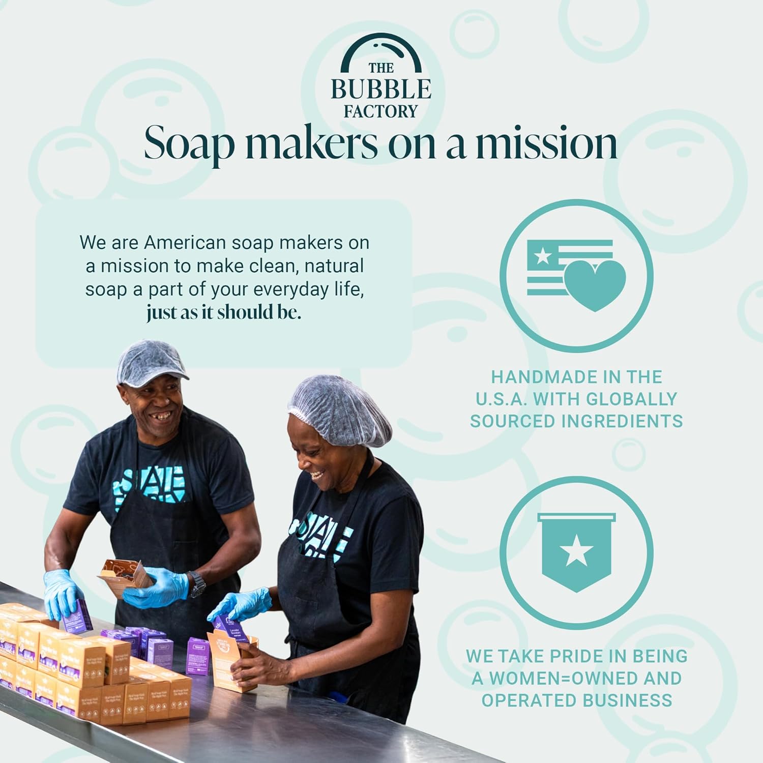 - THE BUBBLE FACTORY: From solo soap maker to dedicated team, The Bubble Factory is a Women-Owned and Operated business on a mission to make clean, natural soap a part of everyday life, just as it should be. Each bar is handmade with care in Arizona, USA, ensuring premium quality and supporting local jobs with simple ingredients, while preserving the cold-process method