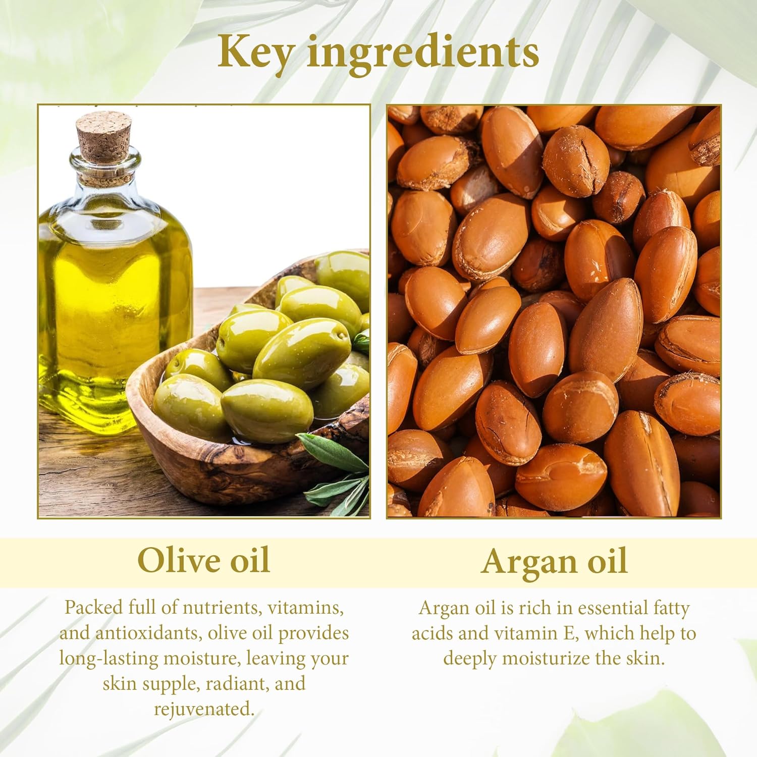 - Long-lasting hydration: Experience the benefits of deep hydration with our olive oil soap. The combination of Olive and Argan Oil provides intense moisture, helping to prevent dryness and maintain a supple and glowing complexion.