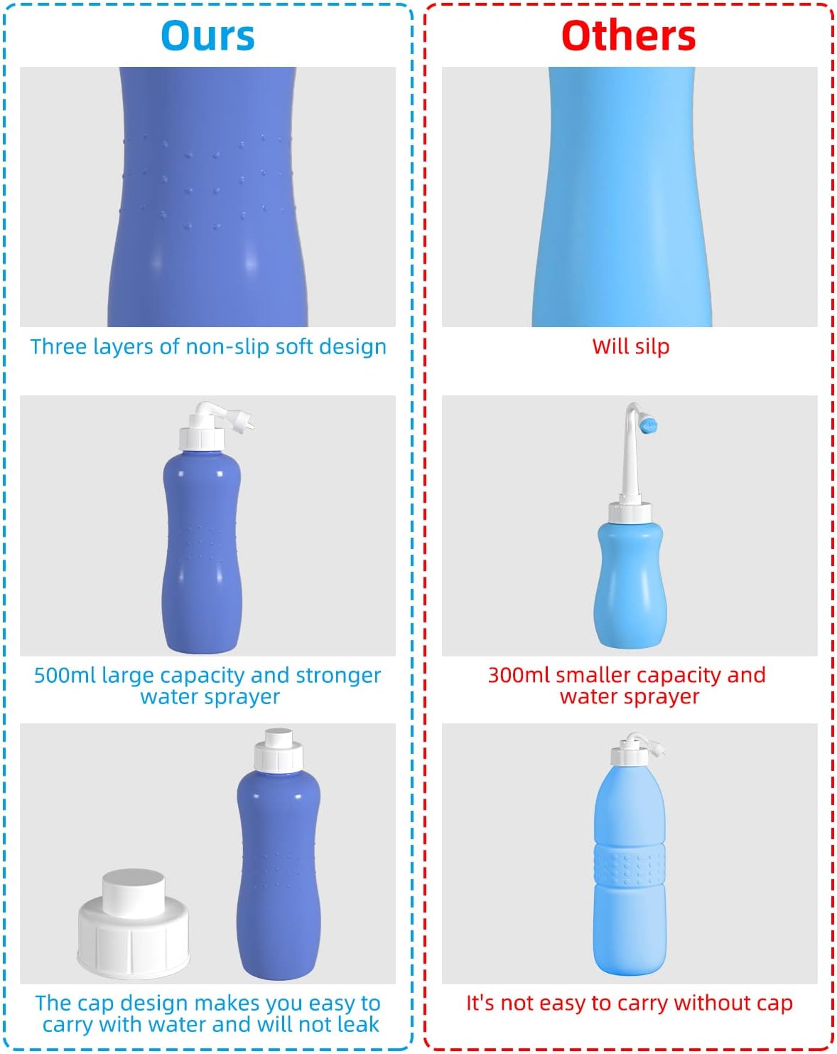 - Large Capacity: Large capacity of 500ml upside down travel bottle offers strong pressure, enough water, and a wider area of cleaning. Portable travel bidet has a convenient travel bag for indoor and outdoor using. Personal bidet sprayer make more complete cleaning, and maintain a high degree of hygiene.