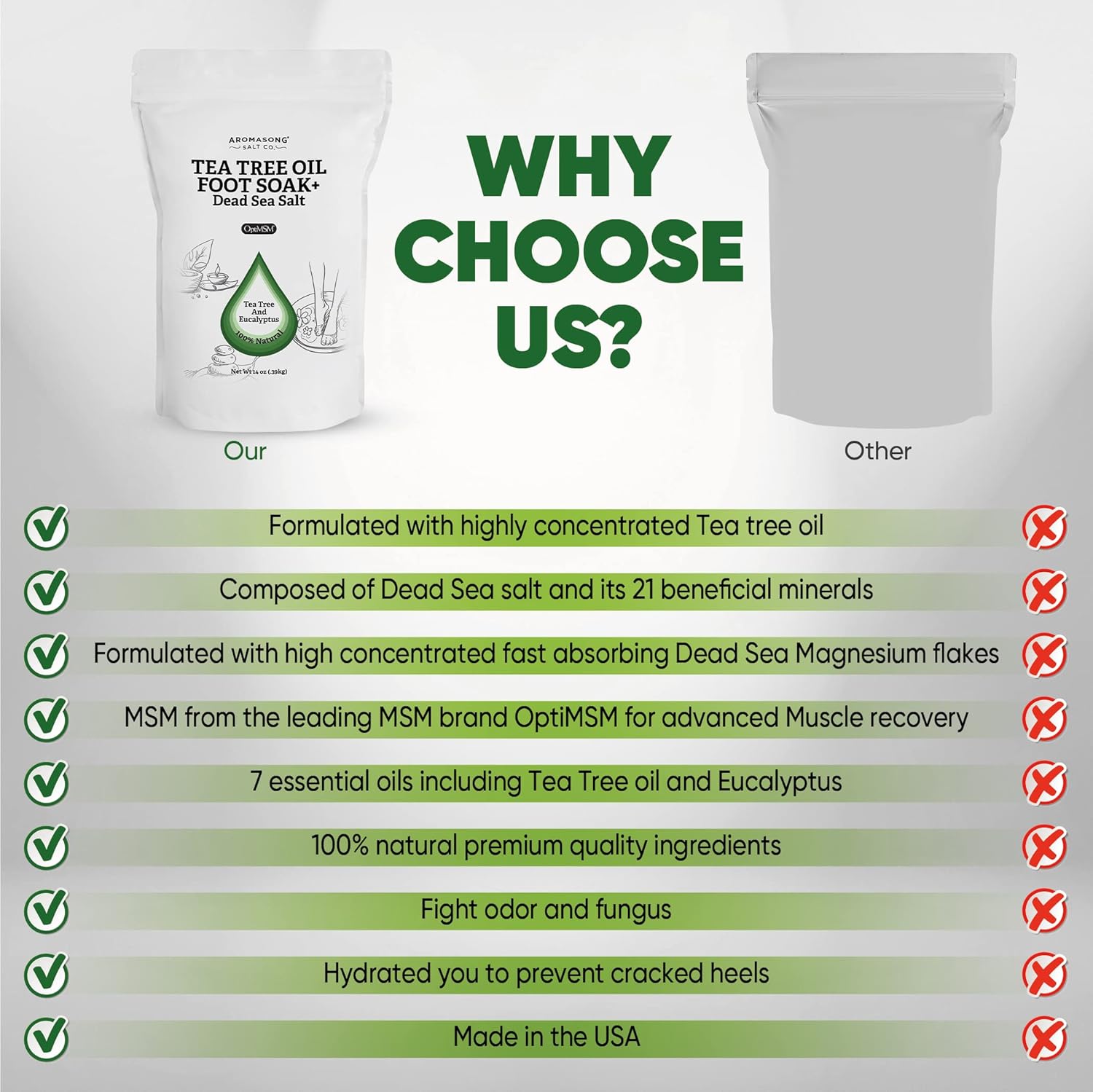 - 👣 Aromasong’s Foot Soak: Our Natural foot bath salt is Formulated with Magnesium Flakes, Dead Sea Salt and its 21 Minerals that soothes tired, achy Feet. Couple that with Tea Tree Oil and all the benefits of the 7 essential oils, fast absorbing dead sea magnesium flakes, and OptiMSM. A 20-minute foot care soak of Aromasong’s Tea Tree Foot Soak will give your feet a daily pampering in the comfort of your own home.