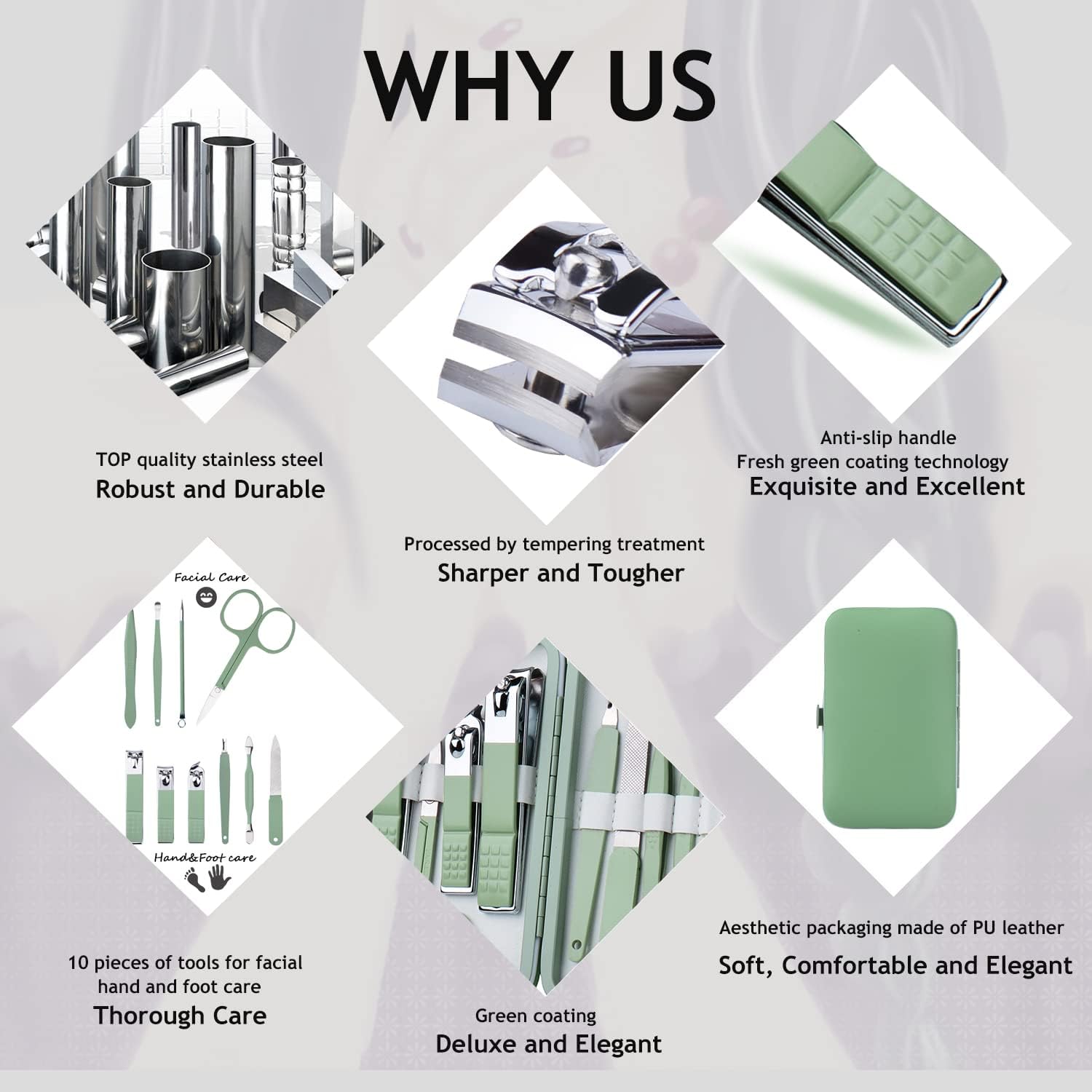 Manicure Set 10 in 1 Stainless Steel, Nail Clippers Scissors Pedicure Tools Kit - Portable Travel Grooming Kit for Men and Women with Leather Case (Jade Green)