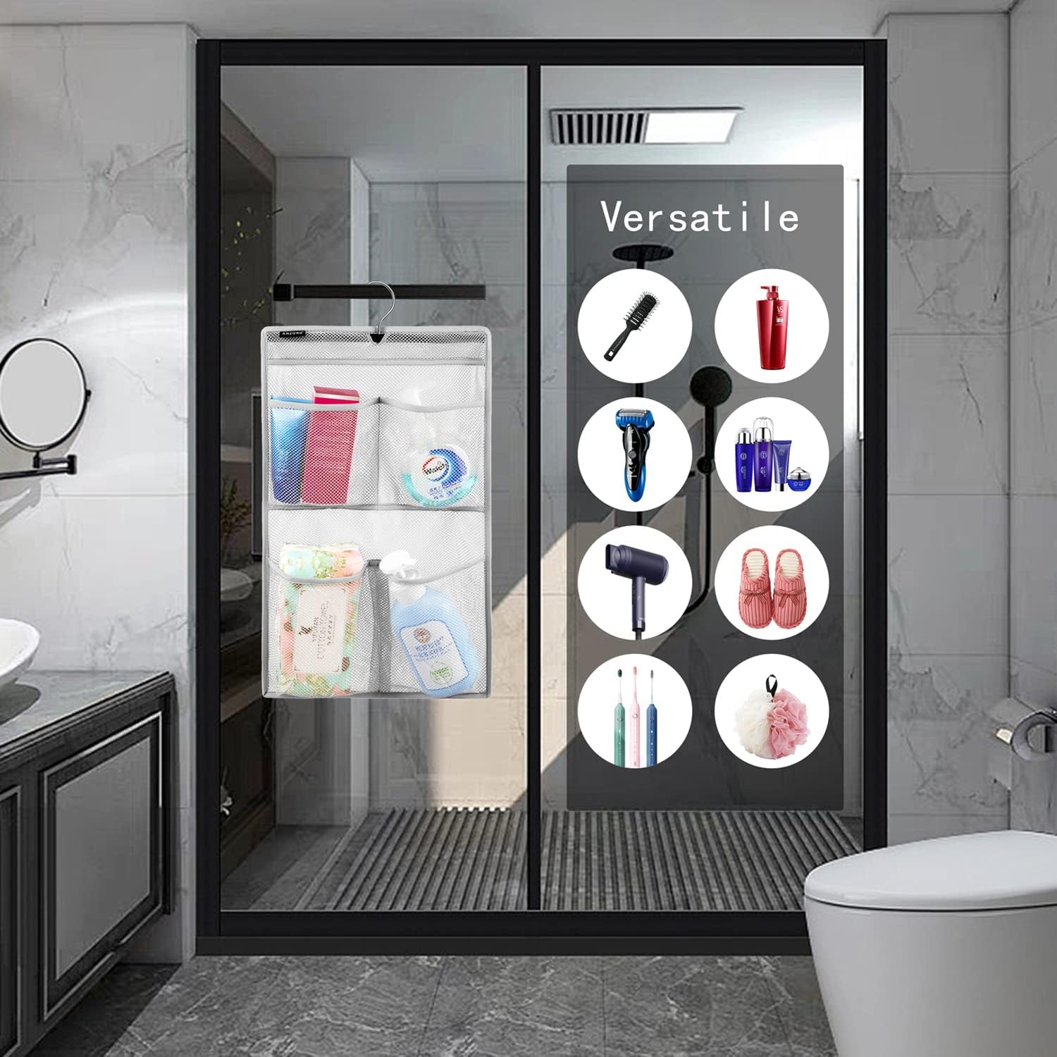 - Bathroom shower organizer measures 20" H x 14" W with 4 mesh pockets. 2 Medium pockets with 5.9" H x 6.7" W, suitable for organizing razors, shavers, toothbrushes and soap,etc. 2 Large pockets with 8.3" H x 6.7" W, suitable for holding cream, facial mask, body lotion, toiletries, towels, hair dryer, shampoo and conditioner, etc.
