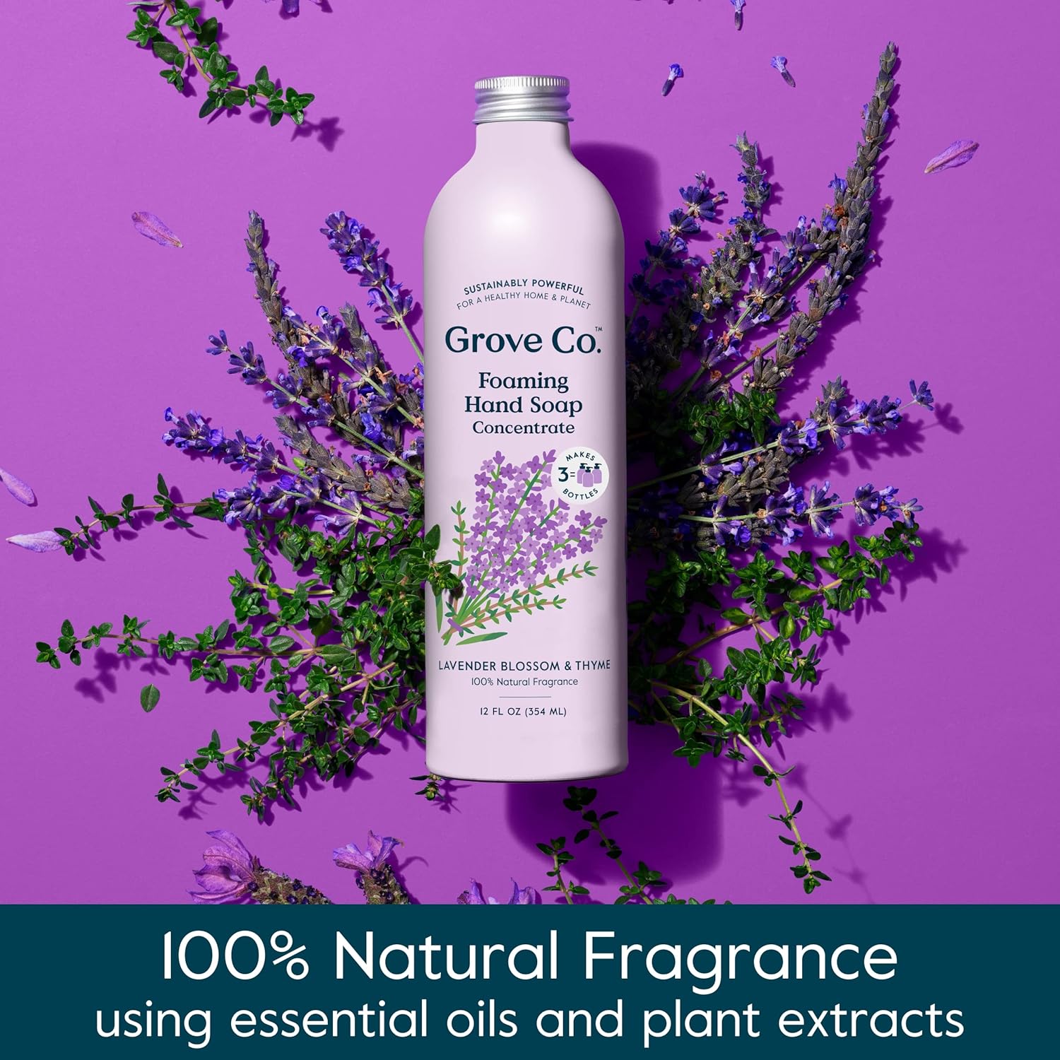 Grove Co. Foaming Hand Soap Concentrate (12 Fl Oz) + Reuseable Glass Soap Dispenser, Plastic Free and Liquid Refillable Starter Kit, Natural Lavender Blossom & Thyme Fragrance