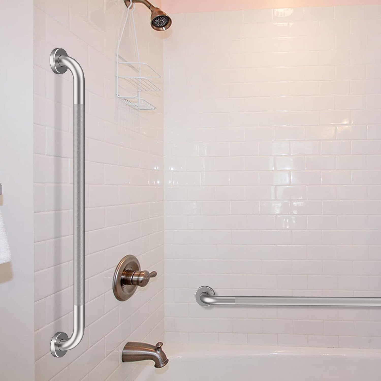 - Munzong 1 Pack 36 Inch Satin Brushed Nickel Stainless Steel Shower Grab Bar; the non slip knurled surface on middle is superior for safety when you have soapy hands and need to steady yourself