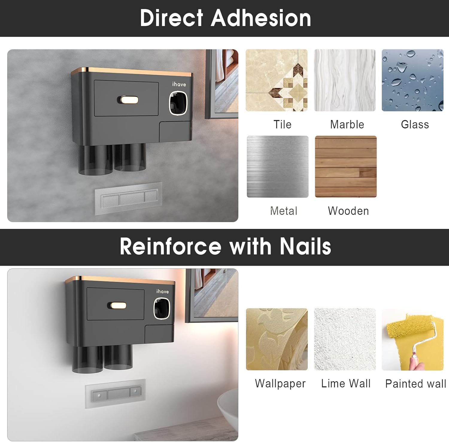 - Sturdy: Our toothbrush holders for bathrooms use a patented non-marking adhesive strip with an excellent caulking effect in humid environments, making it firmly bonded regardless of metal, wood, mirror, ceramic tile, or marble. If the wall is uneven, painted, or wallpaper, we have prepared nails for you to drill and reinforce the mounting. This adaptable design makes it a versatile solution for any home.