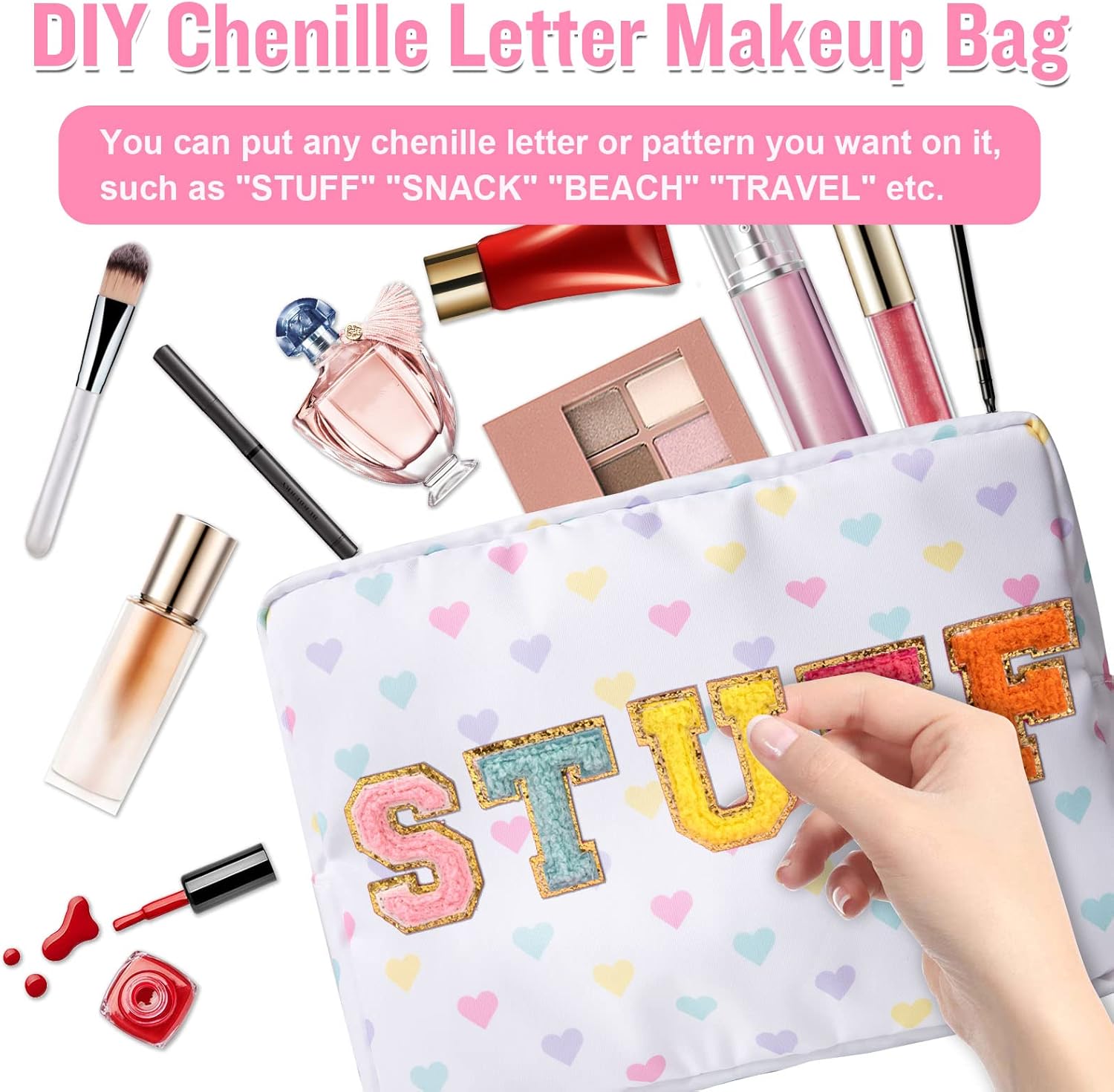 - ❤【DIY Your Bag & Patches Friendly】Large makeup bag material allows you to easily attach your favorite patches and fits all travel toiletries. You can put any chenille letters or patterns you want on it, "STUFF" SNACK "BEACH" and so on to design your unique travel makeup bag. Make your preppy makeup bag very interesting and vivid!