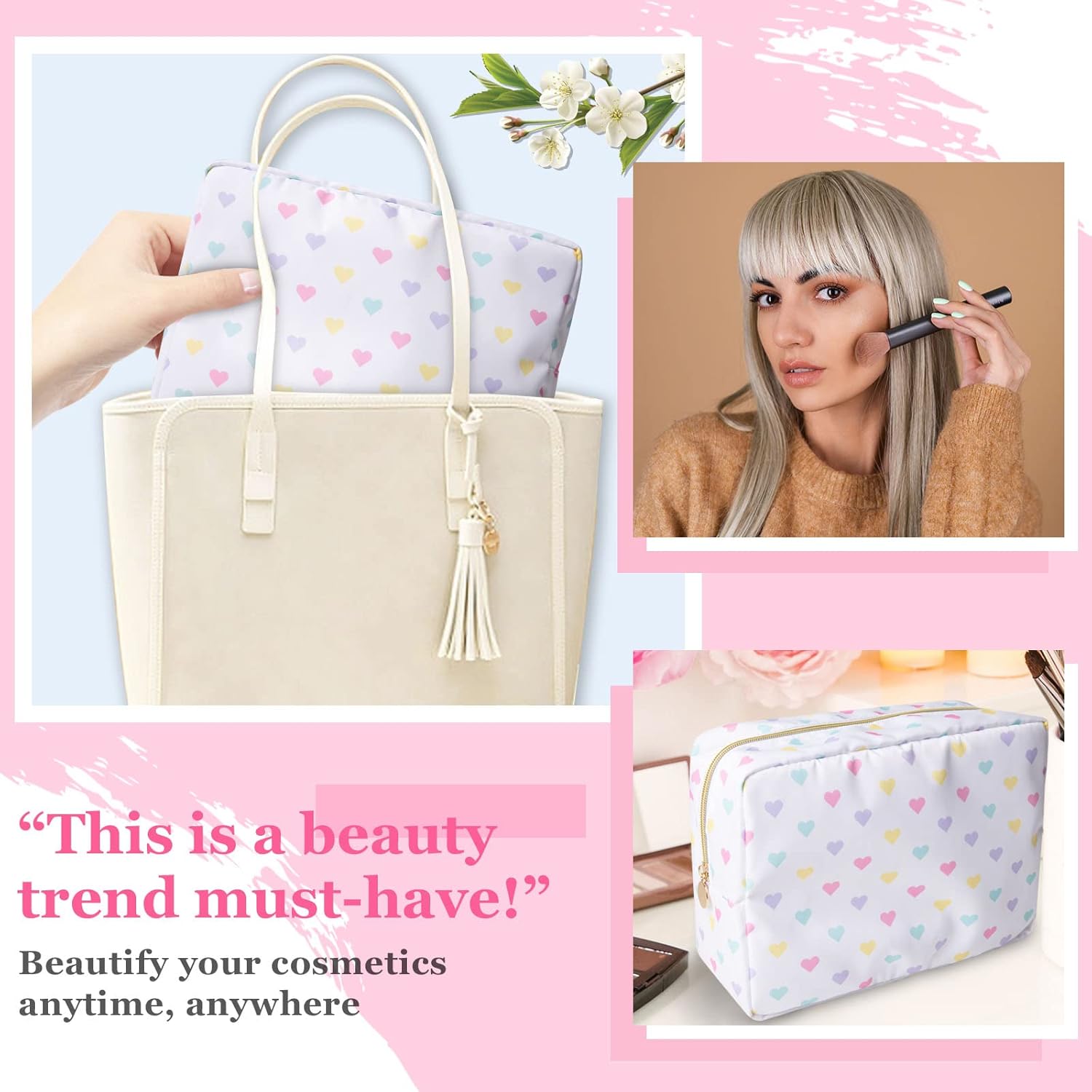 - ❤【Multiple Sizes & Colors】Large, Small, Mini, or Slim, we have it all! Cosmetic bag has a variety of patterns to choose from: pink hearts, black houndstooth, black and white grids, pink and blue grids for you to choose. Nylon makeup bag for purse can be used for travel, outdoors and organization, it can be used as a makeupbag, travel pouch and more.