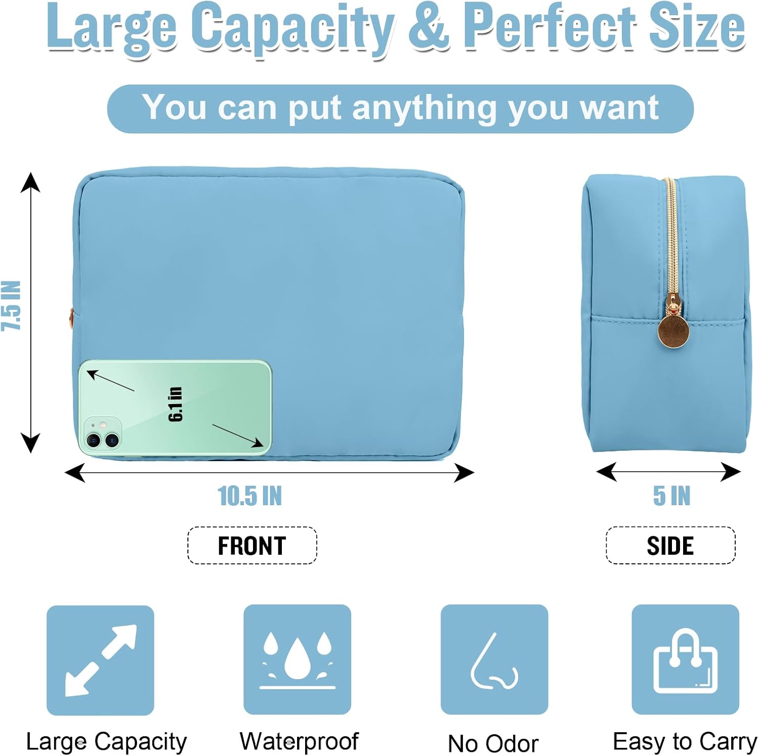 - ❤【Premium Materials】Large makeup bag is made of high-quality nylon waterproof material and durable gold zipper, which does not fade, has no peculiar smell, and is durable. Stylish appearance, easy to wipe clean, dustproof and waterproof. The makeup pouch interior is covered with thick sponge to protect your belongings at all times.