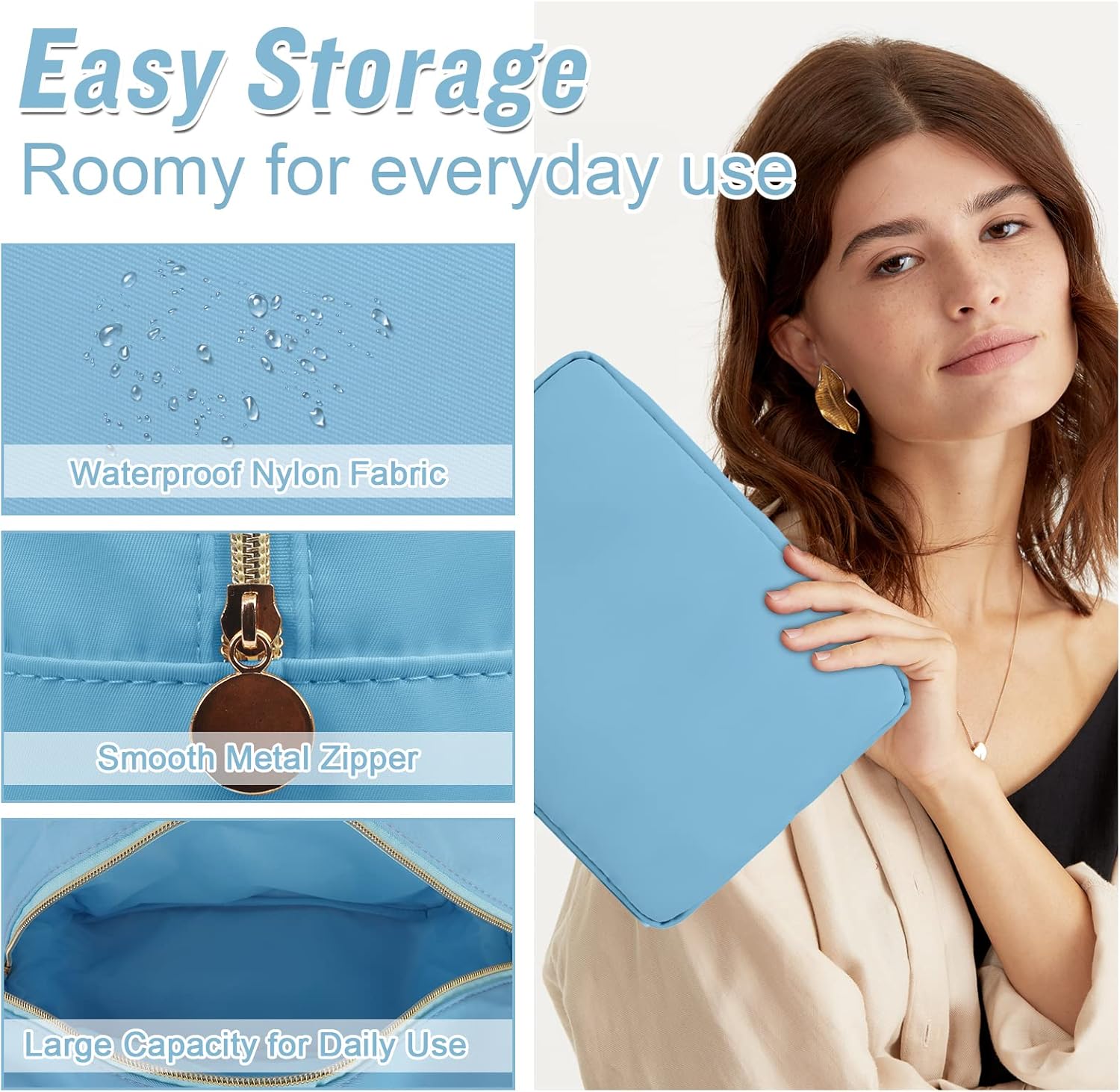Nylon Large Makeup Bag Travel Cosmetic Bag Pouch, Preppy Big Makeup Bag Cute Cosmetic Zipper Pouch Purse, Waterproof Toiletry Bag Clutch Make Up Organizer Travel Essentials for Women Men Girls(Blue)