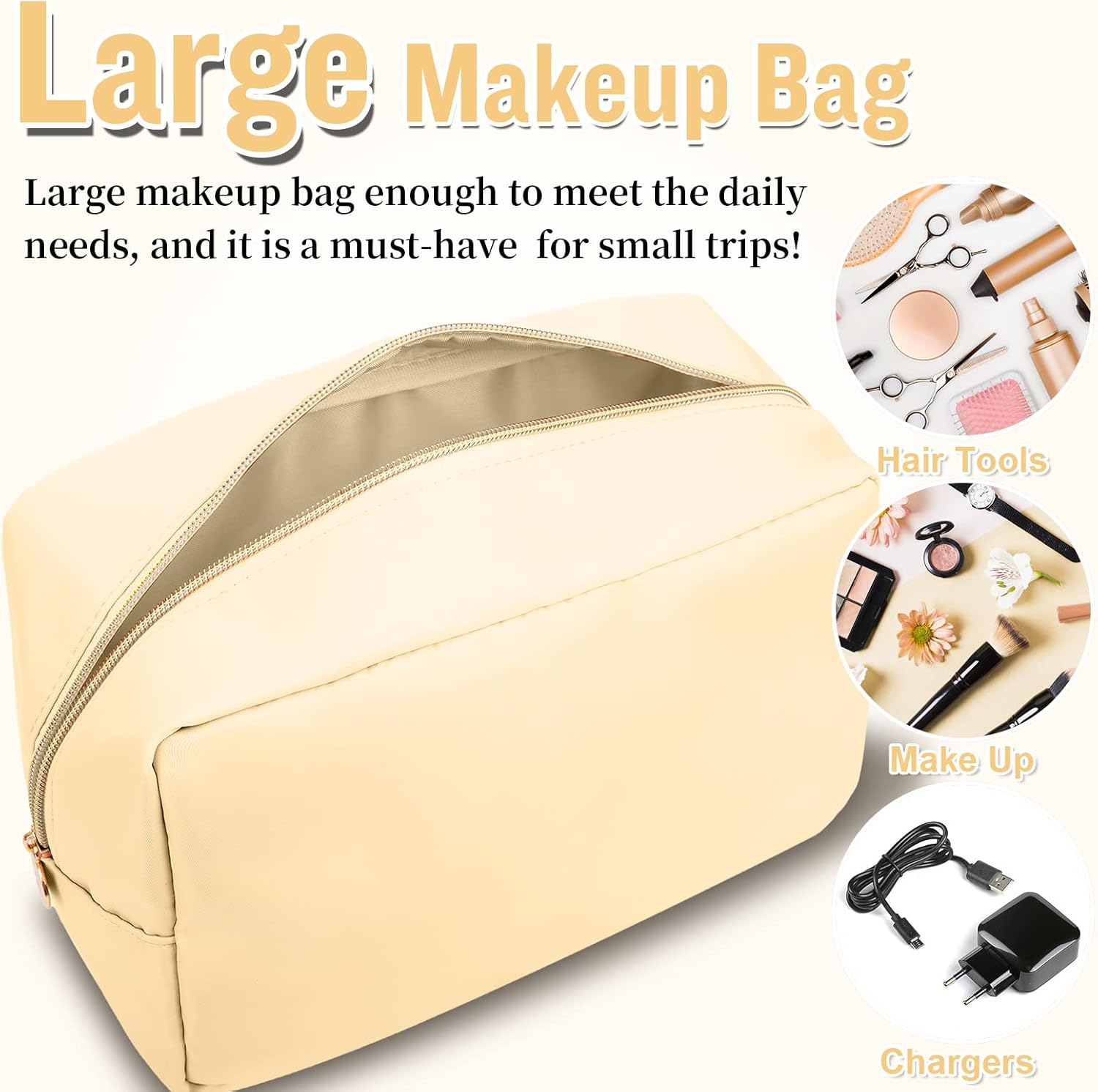 Nylon Large Makeup Bag Travel Pouch for Women, Preppy Big Makeup Bag Cute Cosmetic Zipper Pouch Purse, DIY Chenille Letter Bag Waterproof Toiletry Bag Clutch Makeup Organizer for Girls (Beige)