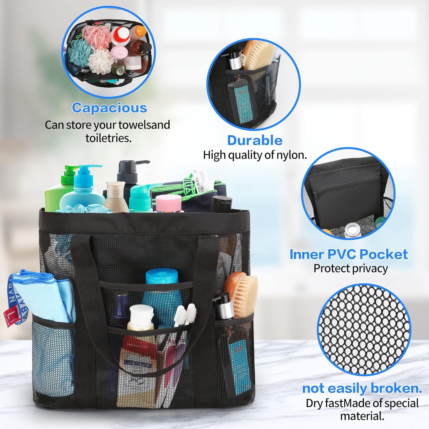 - HIGH QUALITY MATERIAL - This mesh shower caddy is made of tough and durable mesh, so you can holds many toiletries and doesn't tear, we reinforced the handle to make bathroom caddy more stable, which can be hung on pegs or carried by hand more comfortable