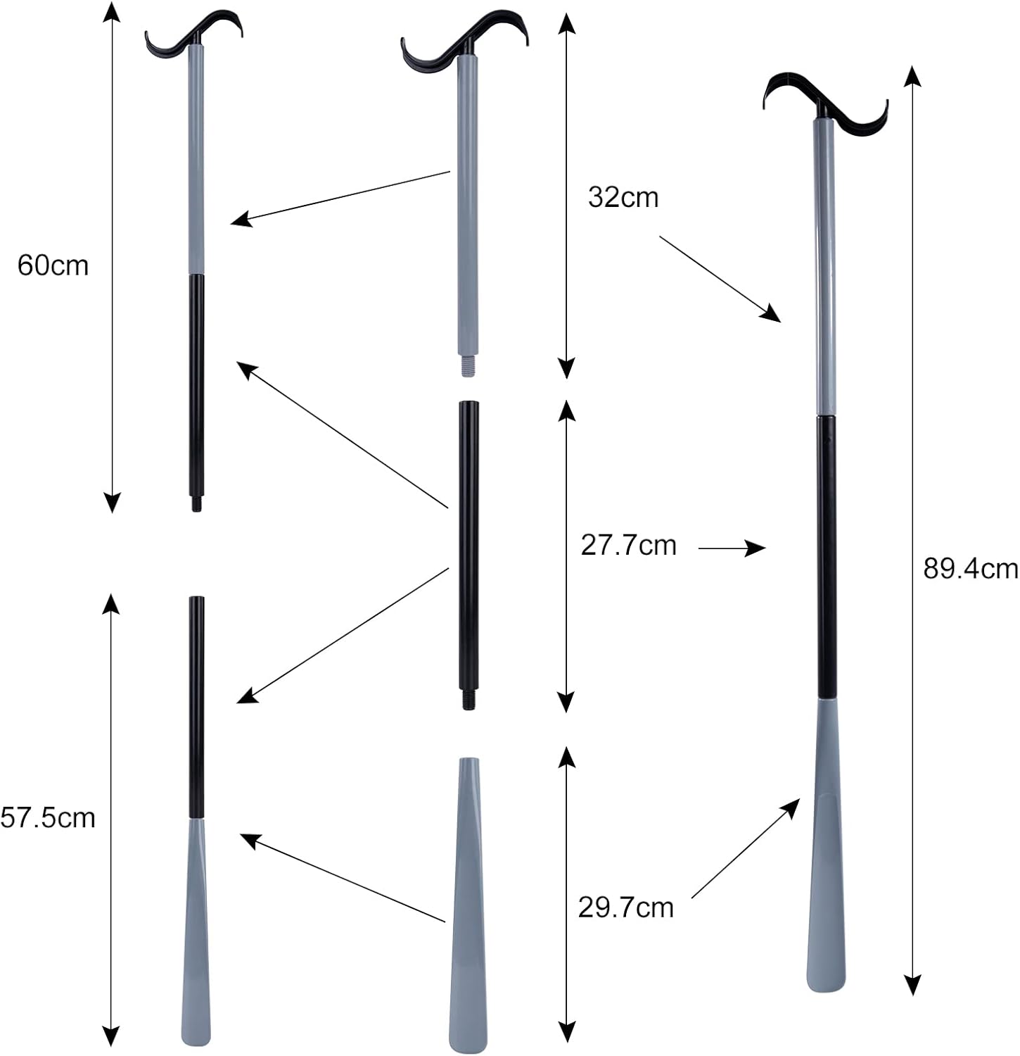 35" Long Dressing Stick with Shoe Horn with Sock Removal Tool, Adjustable Extended Dressing Aids for Shoes, Socks, Shirts and Pants Grey and Black