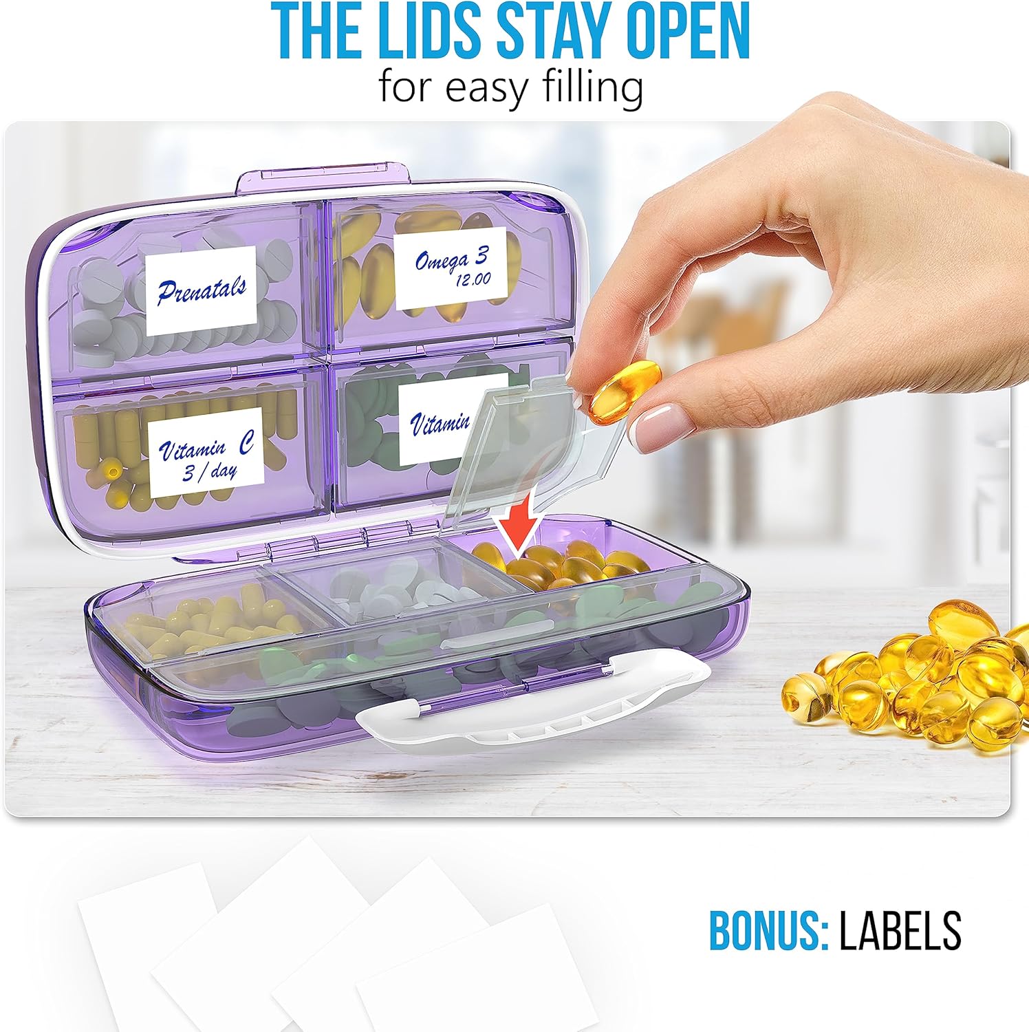 Travel Pill Organizer - Airtight Medicine Case for Traveling Portable Pharmacy Box with Labels Vitamin Container 8 Compartment Supplement Medication Holder Large Capacity Daily (Purple)