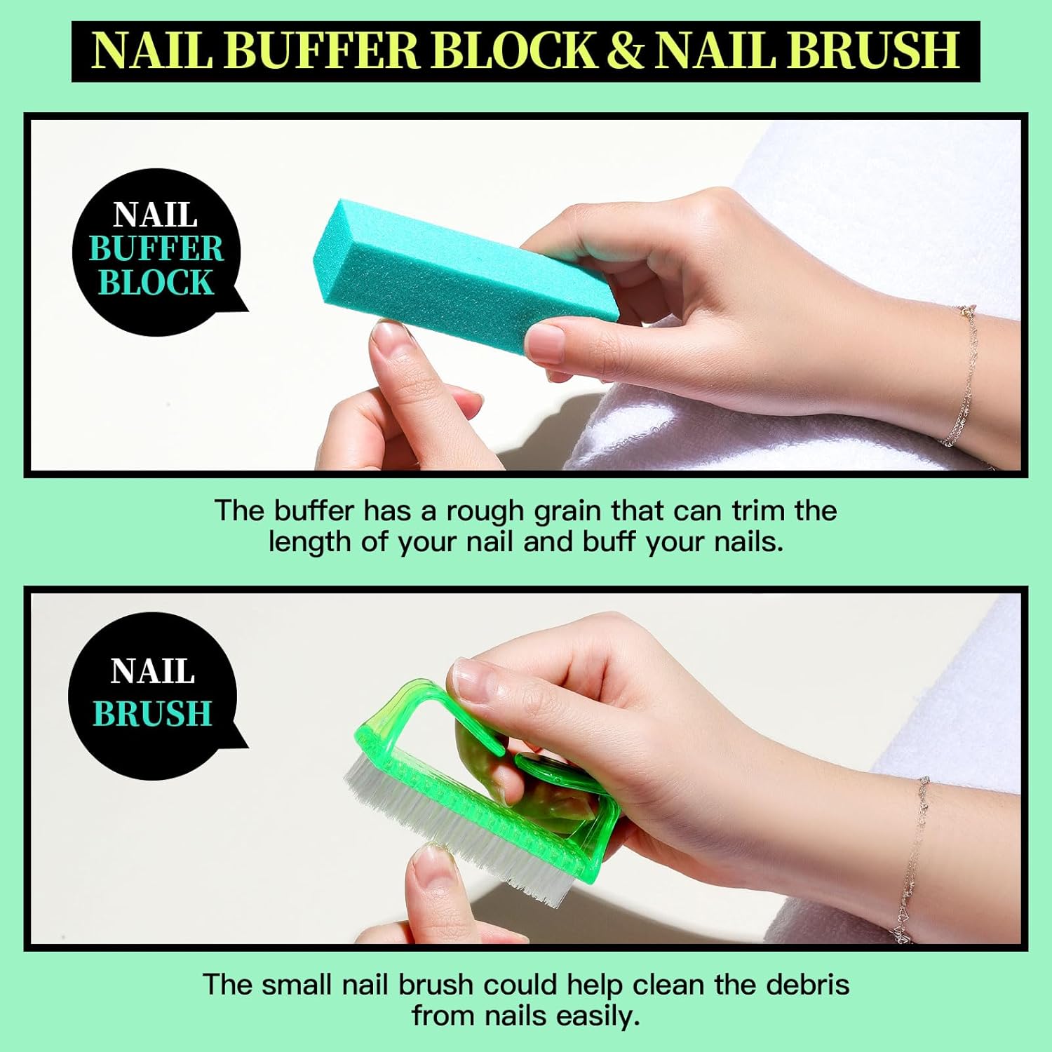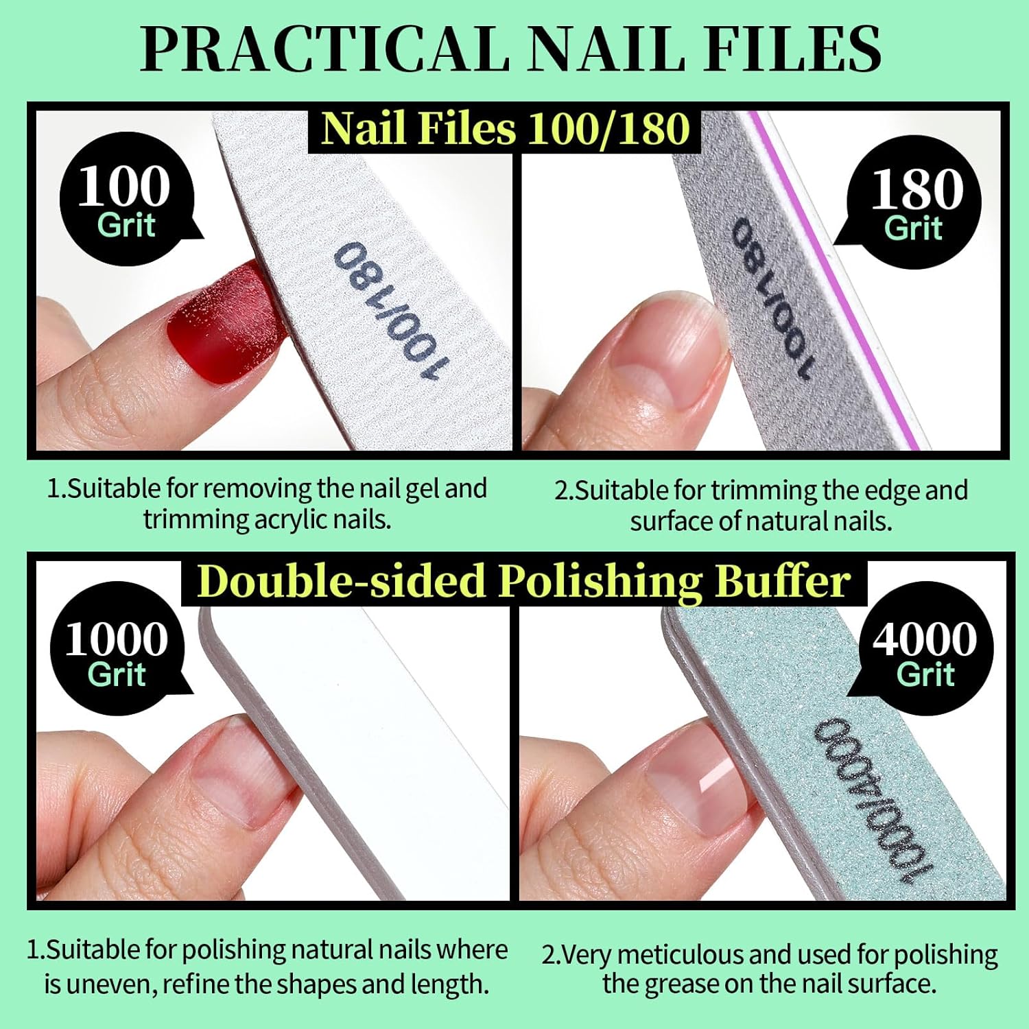 - Practical Nail Care Kit For Filing & Polishing: The nail files 100/180 grit are coarse-grained, suitable for removing nail gel or nail polish, also for toenails. For accurate filing on the edges of the nail and trimming the shapes and length according to your needs. The buffer and polishing files are suitable for polishing uneven nail surface to make your nails smooth and shiny. The small nail brush can help to easily brush the residue off the nails.