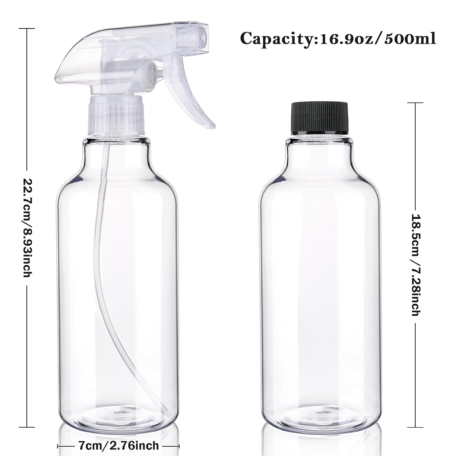 - SATISFIED SERVICES: Our 2pcs 16.9oz/500ml Plastic Spray Bottle set includes an extra spray nozzle, a funnel and 2 caps ,if you have any problem with our bottles, pls let us know, we will do our best to meet your satisfaction.