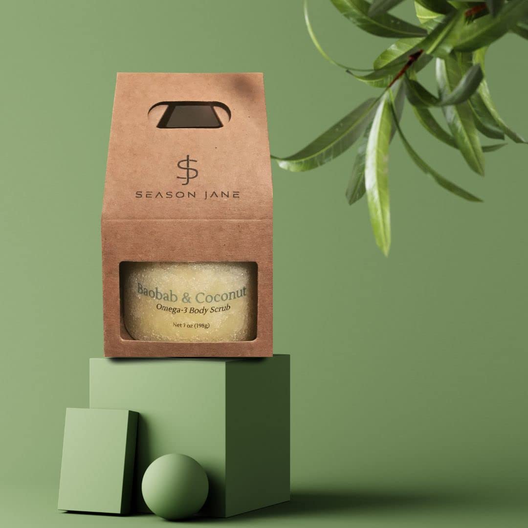 Organic Baobab & Coconut Omega Body Scrub 7oz. Omega rich exfoliator for acne, wrinkles and marks. Vegan, Gluten/Phthalates/Parabens Free. Made in USA.