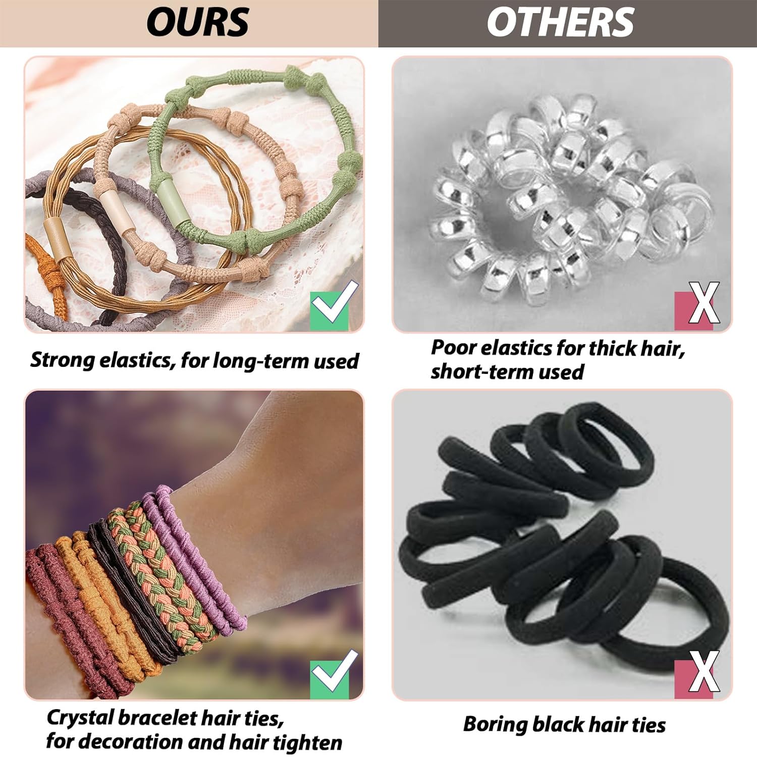 - ③【Two Usage】: The hair ties can be used for thick, curly hair and ponytails, holding hair well for a long time without hurting it. When the hair ties is on your wrist, it becomes a bracelet. It's so special to stack multiple hair tie bracelets as hand decoration.