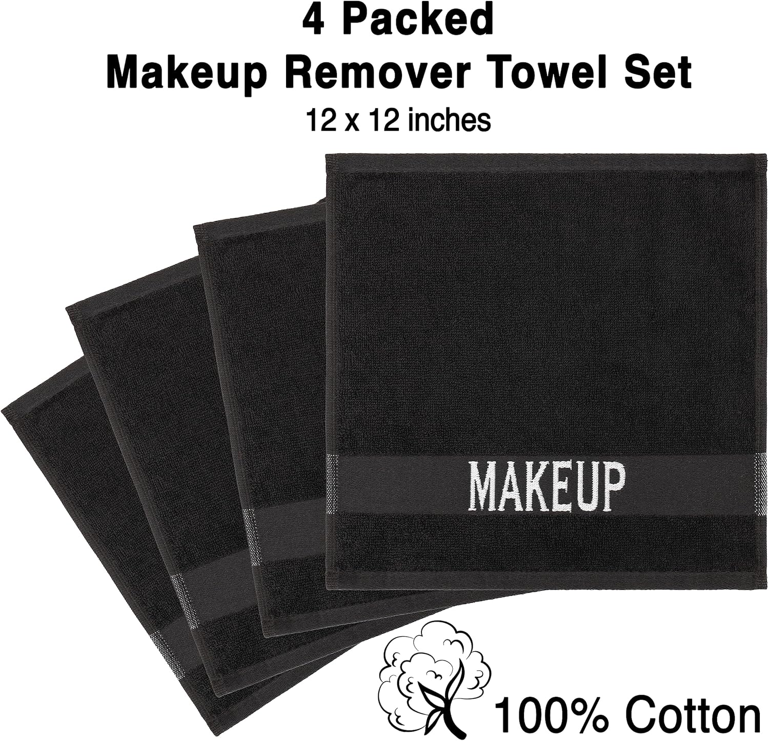 American Soft Linen, Makeup Remover Face Cloth, 100% Cotton Makeup Towels, 4 Packed Face Towels, 12x12 inches, Black