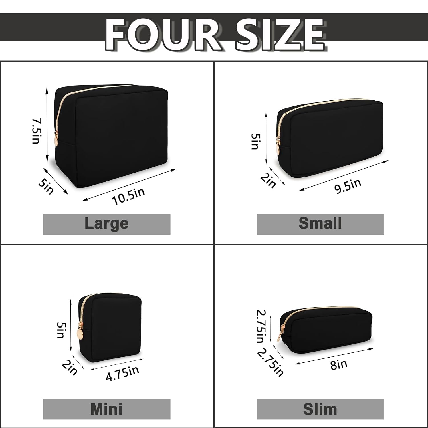 - 【Multiple Options】The cute makeup bag has four sizes, Mini(4.75''*2''*5''), Small(9.5''*2''*5''), Large(11''*5''*8'') and Slim(2.75*8''*2.75''). You can choose the right size according to the items you want to store. We have nine colors, Bubblegum, Sand, Chocolate, Periwinkle, Cotton Candy, Peach, Flamingo, Grape and Khaki. You can enjoy choosing the color you like.