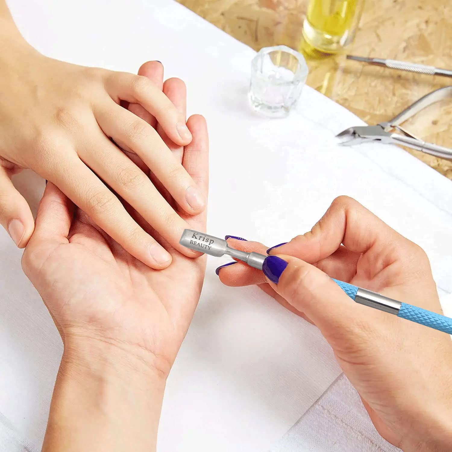 - ✔High Quality Cuticle Pusher Tools - These manicure/pedicure tools are made of professional fine quality stainless steel. The Nail Care Tools are well made with ergonomic design, which help you no more suffer pain; provide you a great home solution to remove Cuticles and delicately treat sensitive areas easily. Cuticle pushers dual sided Krisp Beauty cuticle pusher bulk pack ingrown toe nail point set flat cuticle pusher combo trimmer cleaner remover for women nail tech must have gentle metal cuticle pusher 2 sided pointed spoon shaped big classic curette cuticle nipper double pointed.