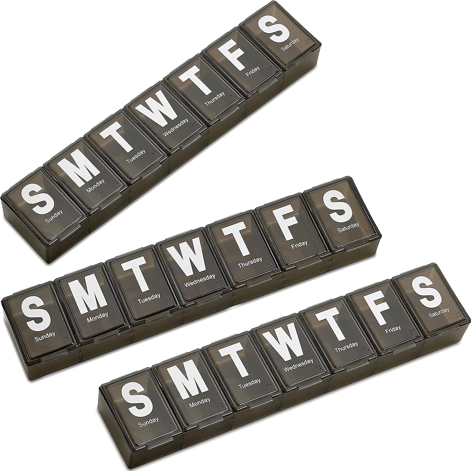Weekly Pill Organizer - (Pack of 3) Extra Large Vitamin Container with Jumbo Easy to Read Letters, BPA Free - Daily Travel 7 Day Medication Pill Box Case, (Black)