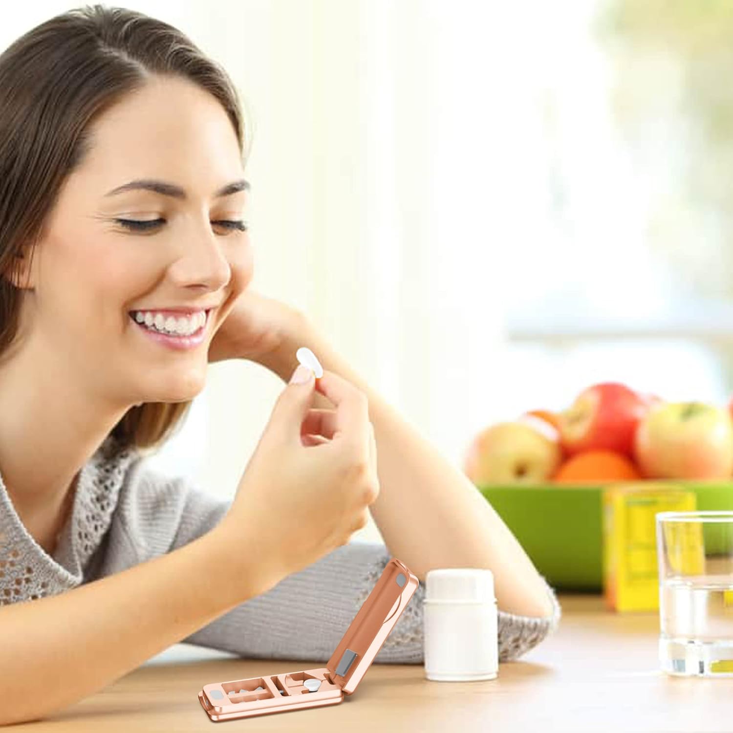 Pill Cutter with Auto Centering Device, Aluminum Pill Splitter with 316L Stainless Blade, Genuine Leather Case, Professional Pill Splitter for Cutting Small Pills or Large Pills (Rose Gold)