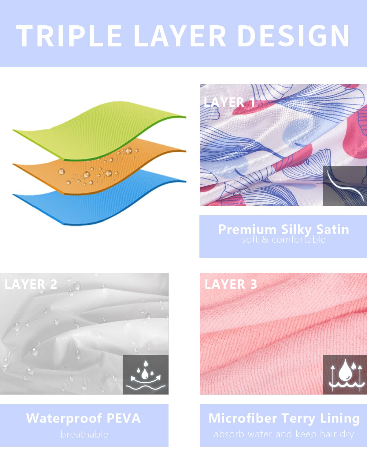 - 【TERRY LINED, KEEP HAIR DRY】Auban shower cap for women is a double-layer waterproof design bath cap. Inside layer is a terry cloth and the outer is waterproof EVA. Terry fabric not only absorbs water but also help to prevent frizz