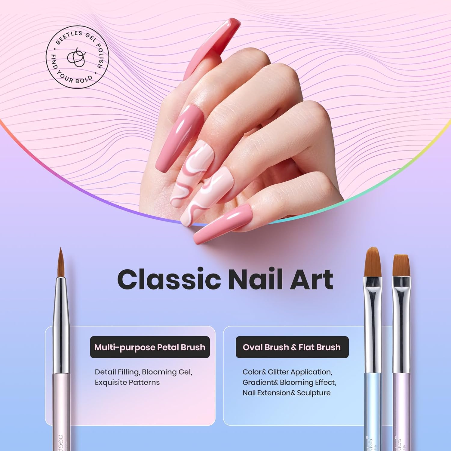 Beetles 3 Pcs Gel Nail Art Brushes Set Gel Polish Design Pen Painting Tools with Liner Brushes Petal Painting Brush and Oval Brush DIY at Home Manicure for Girls