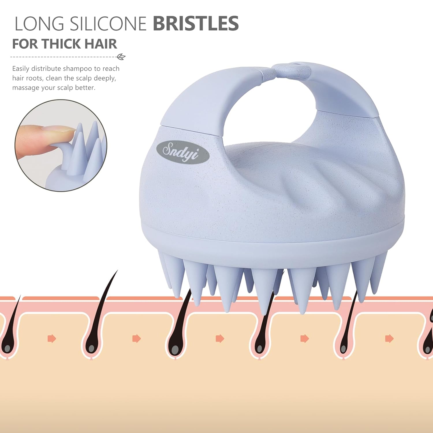 - Ergonomic Design: Sndyi hair massager for hair growth comes with 44 high-density brush teeth, each 0.67 inches long, can easily penetrate all kinds of hair and get the largest working area. The hanging handle and non-slip grooves are ergonomically designed to fit your palm perfectly for a stable grip even in the shower