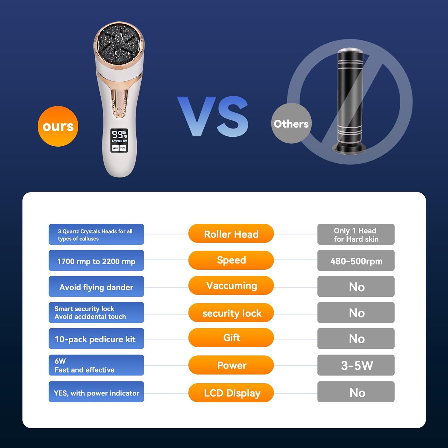 - 【3 Grinding Heads and 2 Speed Adjustable】Our callus remover for feet electric is equipped with three quartz crystal roller heads, which can be quickly replaced to meet the removal needs of different calluses or dead skin. The 2-speed adjustable design provides a more comfortable foot care experience. The foot callus remover has 2 speeds: 1700x/min at low speed and 2200x/min at high speed.