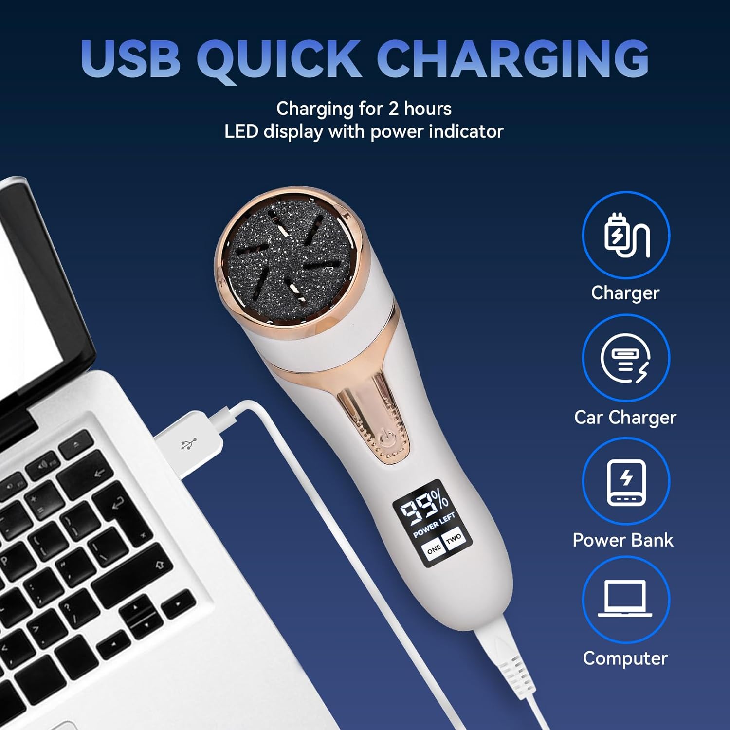 - 【Rechargeable and LCD Display】Built-in 1200mAh large-capacity lithium battery, this electric callus remover can be charged via any USB port, which can fully charge in just 2 hours. The LCD power display allows you to clearly know the remaining battery level, reminds you to charge in a timely manner, and also allows you to see the selected speed more clearly.