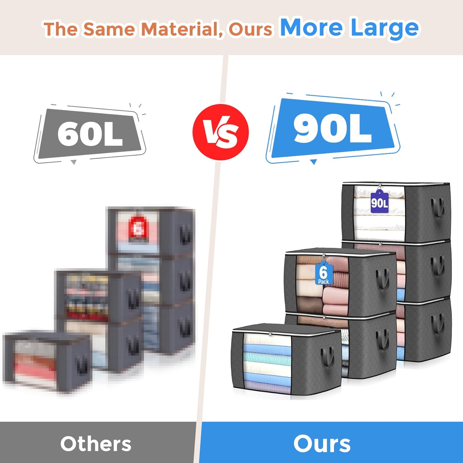 - Large Capacity: Each storage bag measures 23 x 16 x 13 inch (60 x 42 x 36 cm). The clothes organizer capacity is 90 L which is designed for travel essentials. It is spacious for your bed sheets, comforters, blankets, pillows, toys, jackets or other clothes