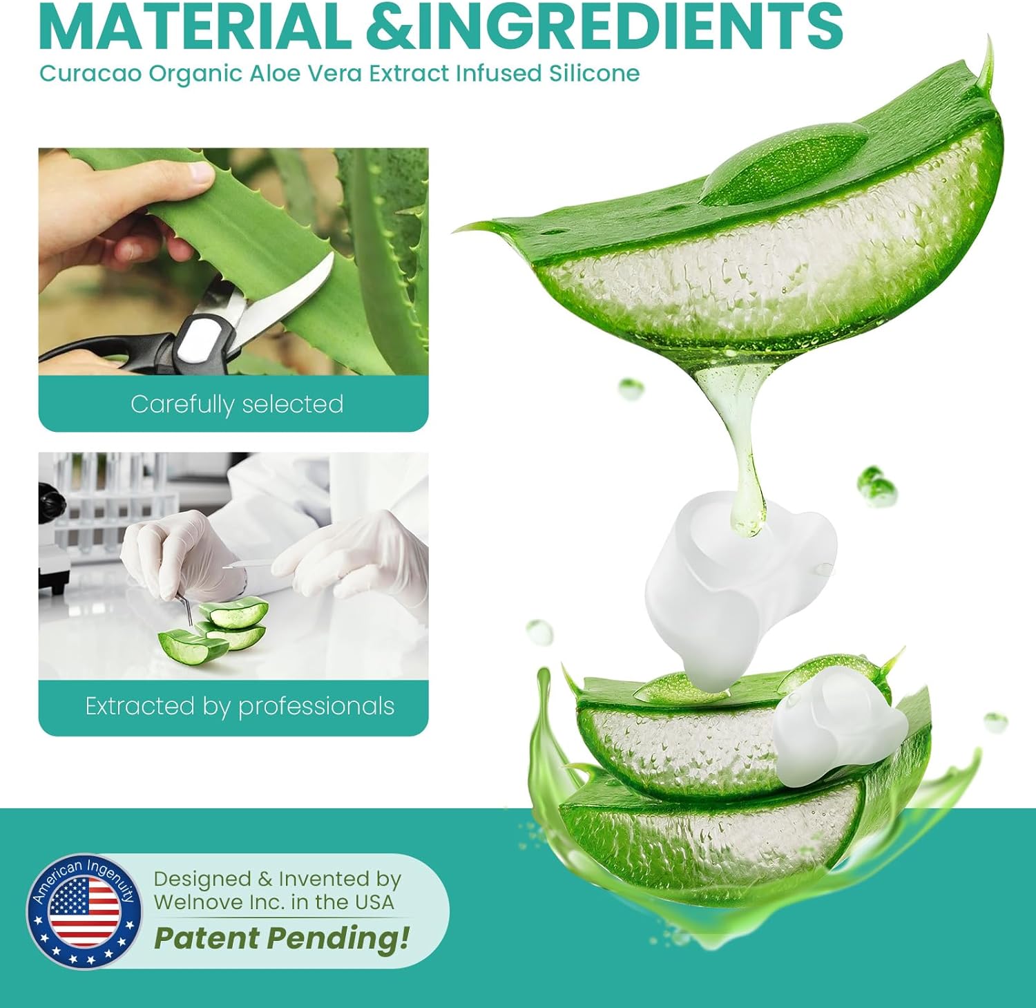 - Infused Aloe Vera Essential Oil -- Unlike others, Welnove silicone toe spacers are specially infused with aloe vera essential oil, providing moisturization to the affected area. These toe spacers for overlapping toes can be worn day and night to provide continuous relief from toe pain while holding your toes in the correct position.