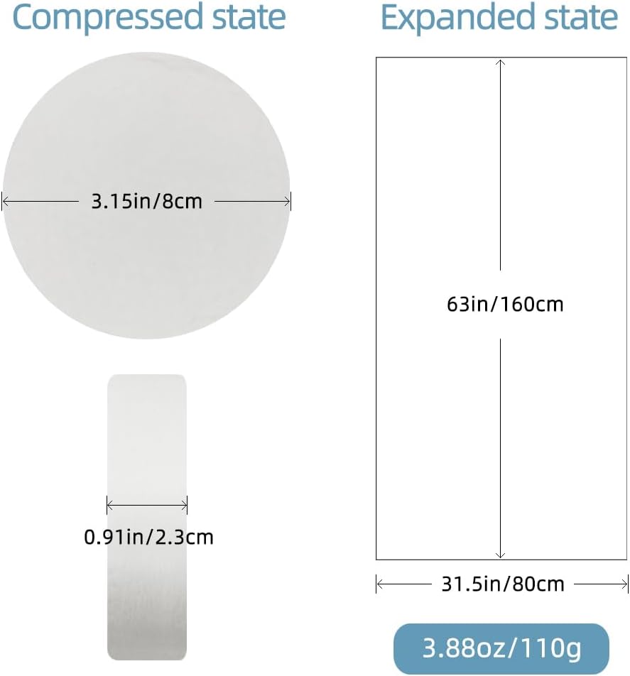 - Magic Towel: Simply drop the small towel tablet into cold or warm water for a few seconds, and it will instantly expand to a 63x31 inch bath towel. This is larger and thicker than similar products on the market, making it perfect for drying off after a shower or swim.