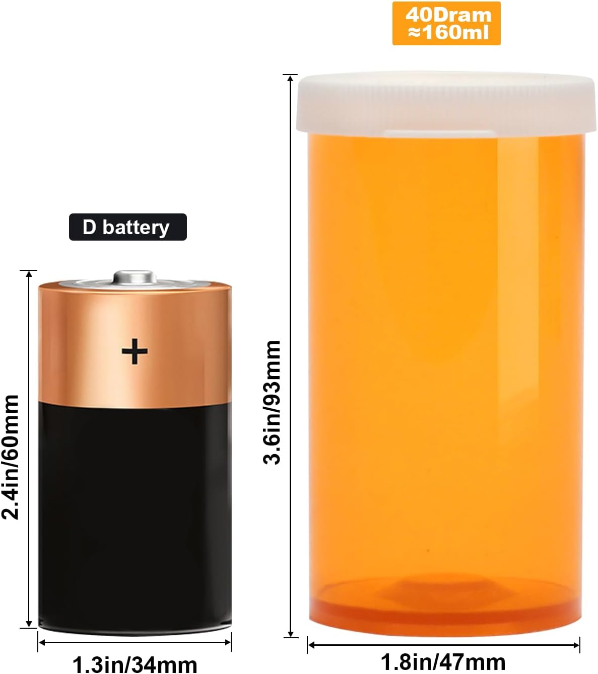 - Perfect Size: Each small plastic prescription vials measures approximately 1.9 x 3.7 inches (47 x 93 mm), 40 dram ≈ 160ml.