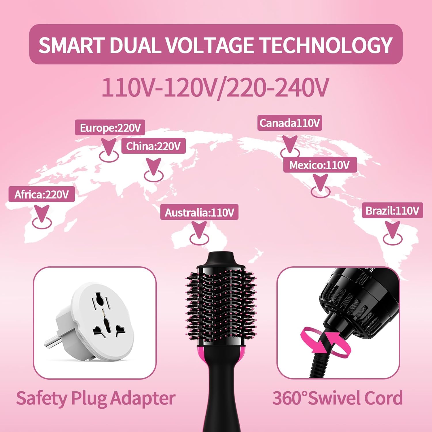 - Innovative Dual Voltage Hair Dryer Brush: Our hair dryer brush features with Smart Voltage Technology, it will detect foreign voltage and adjust automatically, while still maintaining all of your heat and speed settings. Working range: USA (110V-120V, meets U.S. safety requirements standard UL.859), Europe (220-240V). Note: When use in Europe, please use the PLUG ADAPTER, NO NEED to use the VOLTAGE CONVERTER again