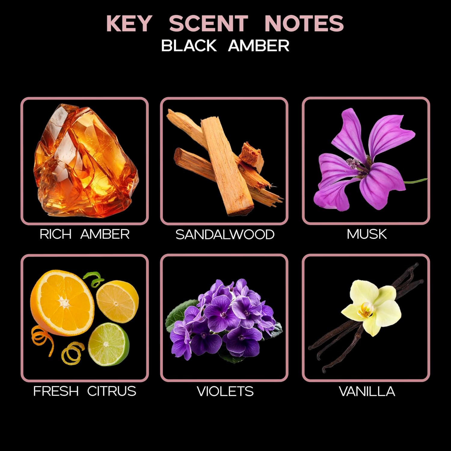 - BLACK AMBER – is a rich and sophisticated blend of Amber, Sandalwood, Musk, Citrus, and Exotic Florals; showcased in our Modern Striped Diffuser, a sleek frosted glass bottle etched with clean vertical stripes for a minimalist yet eye-catching look, topped with a slender neck and delicate black ribbon accent for a refined, timeless look, adding bold, dramatic appeal; pairs beautifully with black, charcoal, and deep neutral décor