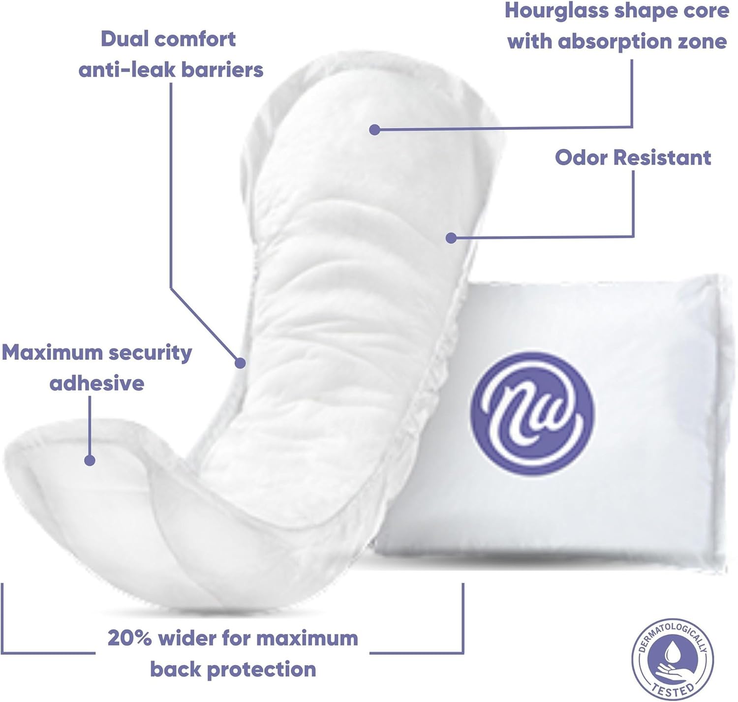 - Ultimate protection: Incontinence pads are designed 20% wider than traditional pads for maximum leak protection, while the secure adhesive strips keep the pad in place all day or all night long