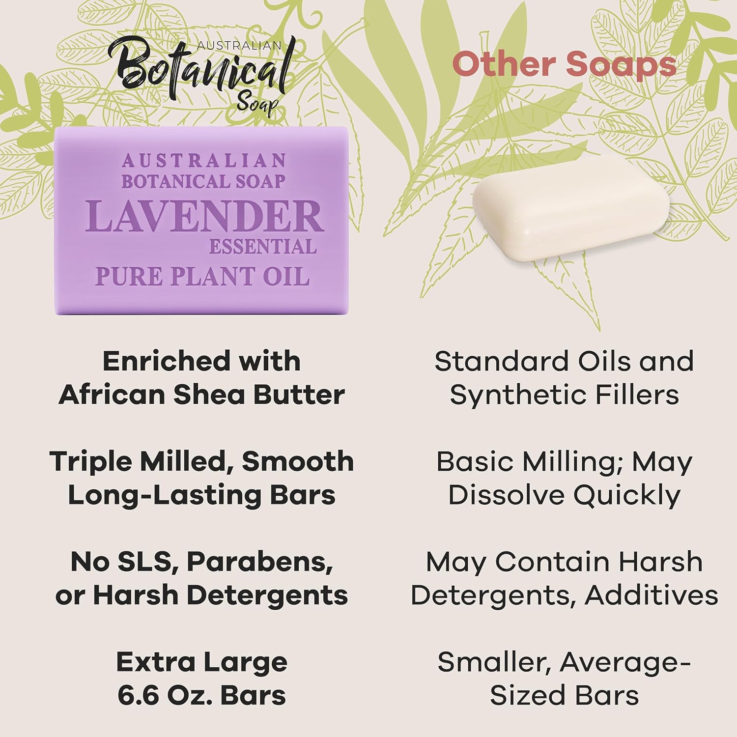 Australian Botanical Soap, 6.6 OZ, Lavender and Essential Oil, Triple Milled Bars made with a Natural Soap Base and Enriched with Organic Shea Butter, Pack of 8