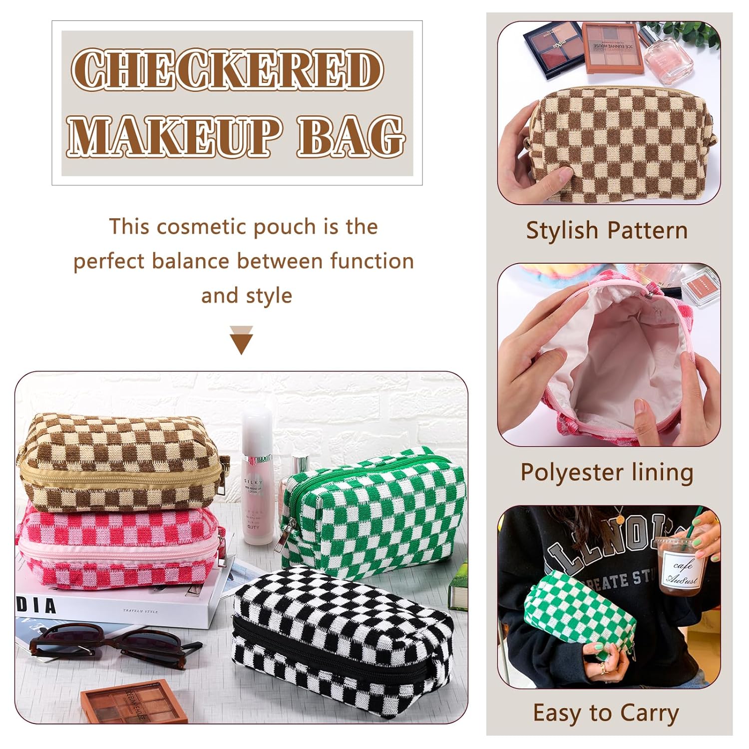 - LIGHT WEIGHT AND EXCELLENT WORKMANSHIP: The cute makeup pouch is made of soft knitted fabric and is comfortable, soft and lightweight. Checkered travel make up bag folds up when not in use and fits in a large bag without taking up space. The metal zipper of the cute pencil case keep your items secure and organized inside. Cosmetic bag accessories set for women