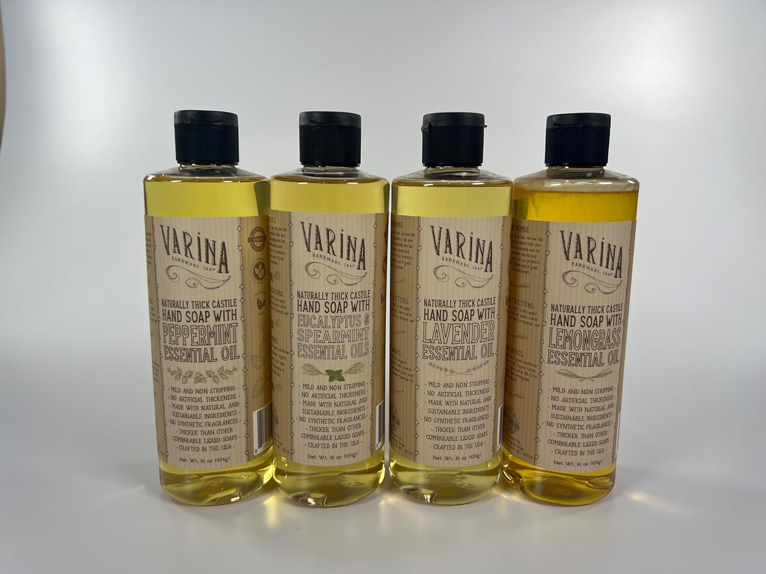 - Variety Pack of Organic Castile Soap – Includes 4 bottles of refreshing scents: Peppermint, Lavender, Eucalyptus Spearmint, and Lemongrass, perfect for everyday handwashing and multi-use cleaning.